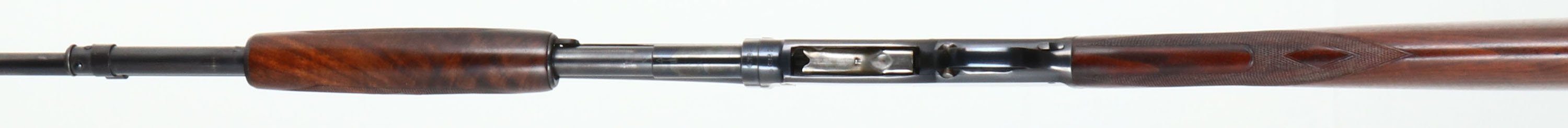 RARE DELUXE Winchester Model 42 DELUXE, 410 GA., MFG. 1946, SN: 56332. Pump Action Shotgun, 3'', Full choke, 28'' matted solid rib barrel. The original factory deluxe checkered, & rare straight pistol grip wood stocks are excellent & solid. The original finish is excellent with only a couple of tiny handling rubs. The scalloped grain is fantastic. The original metal blue finish rates 99% on barrel & receiver & 97% on tube. Bore is excellent. Stock carries the original Winchester buttplate. Barrel has a red front bead. Probably the nicest deluxe 42 we've ever offered. 13 7/8'' LOP.* FFL or C&R Req. - Value: 6000 to 12000
