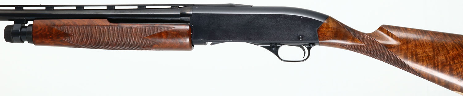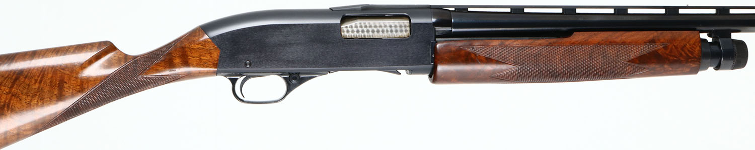 RARE John M. Olin Collection, Winchester, Model 1200 DELUXE, 20 GA., MFG. 1964-65, SN:169639, Pump Action Shotgun, 2 3/4'', WS-1 choke. 26'' Vented rib barrel. This shotgun comes with a copy of a letter from Eugene F. Williams Jr., executer of the Jon M. Olin estate, which lists the guns that were the personal property of the late John M. Olin. The letter states the guns were housed & used as hunting guns on the Family's Nilo Plantation since their manufacture or time of purchase by Mr. Olin, or the purchase of the Nilo Plantation in 1955. This shotgun is the 5th gun on the list. This gun features Special Order XXX walnut, straight grip stocks, with wraparound deluxe checkering. The stocks were specifically made to Mr. Olin's desired shape & dimensions, which is evident by the very narrow wrist dimension, curvature of the lower wrist into the belly & the initial oval in the belly of the stock with Mr. Olin's initials ''JMO''. Note that standard Model 1200's had pistol grip stocks. The stocks display fantastic scalloped & fire grain, with crisp checkering & excellent factory finish. The factory metal blue finish is 97% on receiver, 99% on barrel & tube. Bore is excellent. Front & mid rib sight bead. 14'' LOP over custom leather wrapped recoil pad. Comes with a laminated 14''x4 1/2'' Winchester/ Western yellow sign which was part of a previous display, which states its from ''The John M. Olin Nilo Collection''. A finely crafted, excellent original condition & custom 1200, with wonderful prominence & ownership. Very collectable gun.* FFL Req. - Value: 2000 to 4000