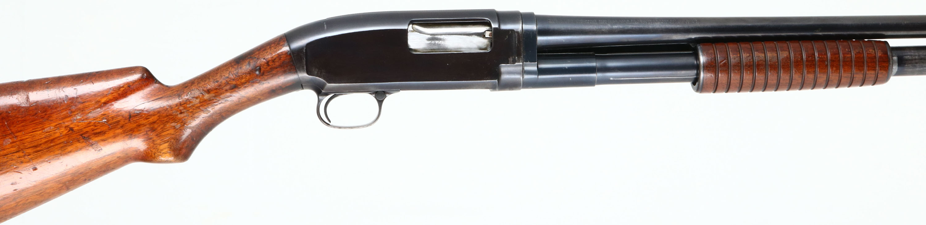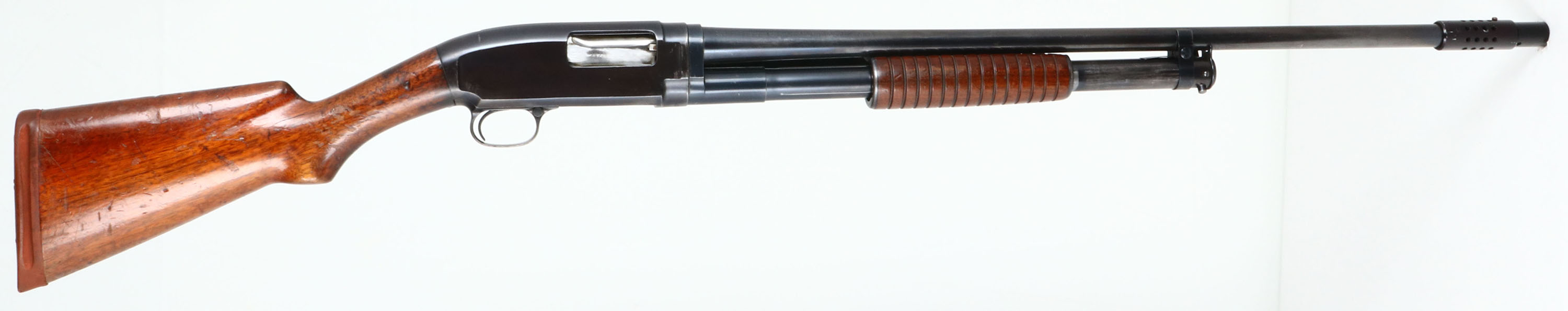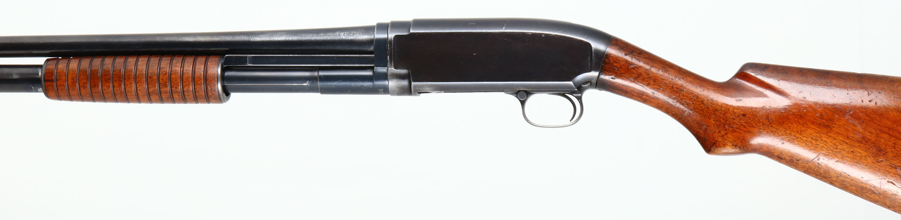 Winchester, Model 12, CAL: 20 GA, MFG: 1920, SN: 24852, Pump Action Shotgun, Choke: Full, 2 3/4'' Chamber, 26 3/4'' Barrel, with Weaver choke. The original flat pistol grip wood stock & corncob forend are good & solid. The stock displays numerous scrapes, dings & scratches, with an added layer of finish. Forearm has few handling marks & original finish. The metal blue finish rates 70% overall. The front half the gun carries the SN 478044. Bore is very good. Single front bead. Buttstock has been cut & carries a period Jostam recoil pad, with LOP 12'' overpad. FFL or C&R Req. - Value: 200 to 400