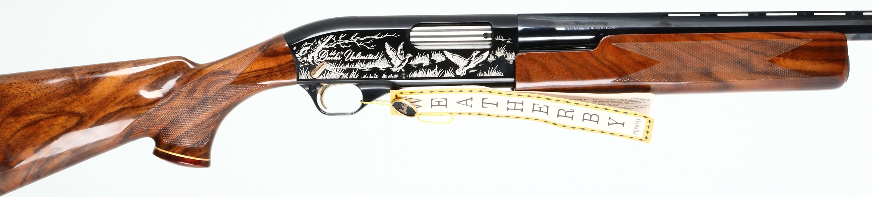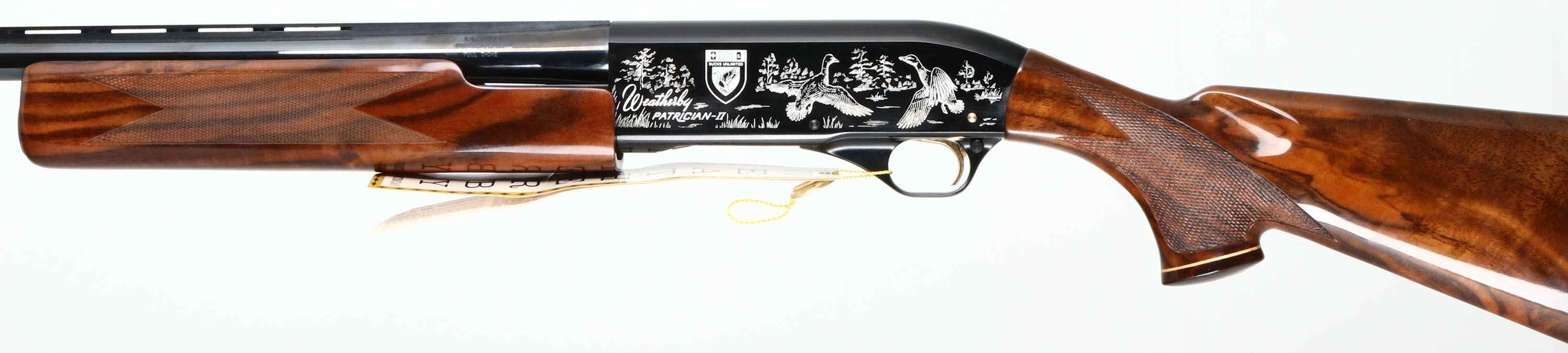 CASED Weatherby Model ''Patrician II'', CAL: 12 GA, MFG: 1976-81, SN: 79-DU1061, Pump Action Shotgun, Choke: F, 29'' Ventilated rib barrel. The Patrician II replaced the original Patrician model & in 1979 they collaborated with Ducks Unlimited to produce a limited number of guns. This is one of those special addition shotguns. The original checkered & capped pistol grip wood stocks are excellent, exhibiting fantastic wood grain. The pistol grip cap has an encased gold tone DU duck's head. There are virtually no defects. The metal blue finish rates 99% overall on the barrel & receiver. The receiver displays laser engravings of multiple ducks, the DU shield & the words ''Ducks Unlimited'' & ''Weatherby Patrician II''. Bore is Mint. Gold trigger. The ventilated rib holds a mid & front bead. Buttstock carries a Weatherby, ventilated recoil pad. Comes with the original hanging tag & instruction manual, in the original DU case, which also has its original hanging tag & key. LOP: 14 1/8'' overpad. FFL Req. - Value: 600 to 1200