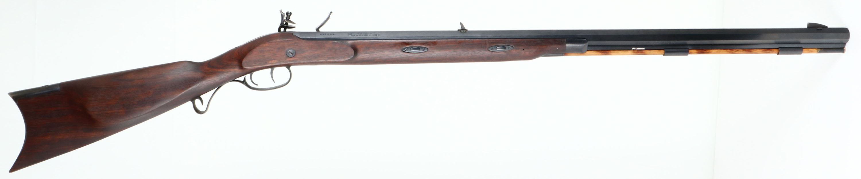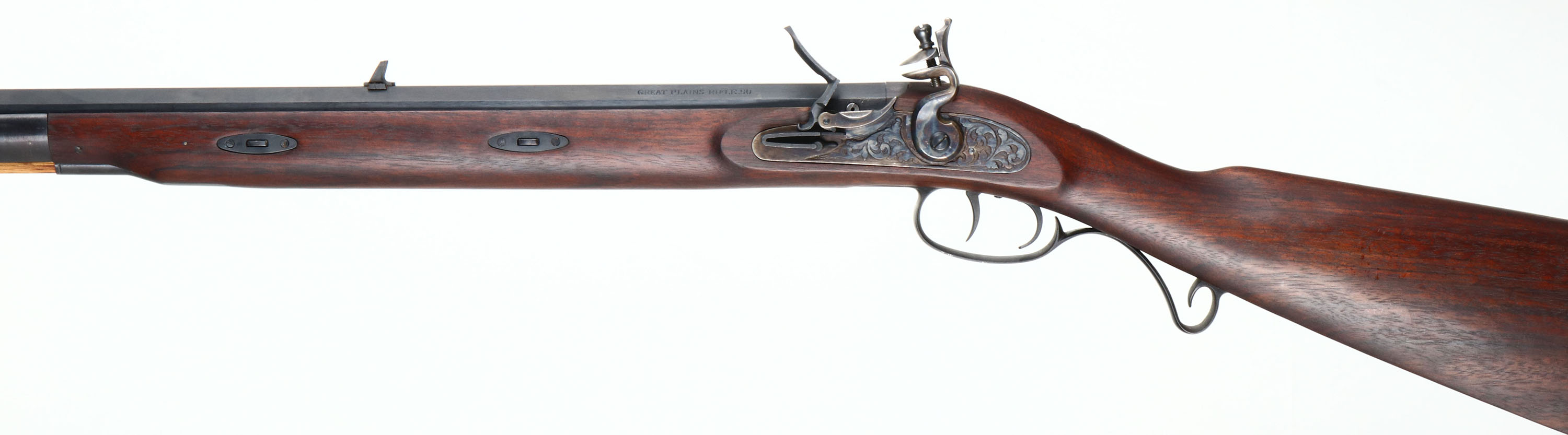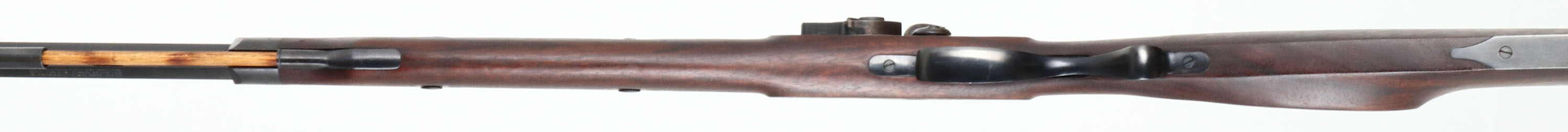 Lyman, Great Plains Rifle (Left Handed), CAL: .50, MFG: modern, S/N: 451093, Flintlock Muzzleloader, 32 1/2 '' octagon barrel. The cheeked straight wrist wood stock is excellent with little to no wear. The metal finish rates 95% with little to no wear or scratches. Left side of barrel is marked, ''GREAT PLAINS RIFLE .50'', top of barrel is marked ''LYMAN-MIDDLEFIELD-CONN.-'', right side of barrel is marked with S/N, & ''MADE IN ITALY'', ''BLACK POWDER ONLY''. Bore is excellent. Thick blade front sight with a deep U-notch rear buckhorn sight, Metal buttplate with little to no wear. Muzzleloader, No FFL Req. - Value: 150 to 300