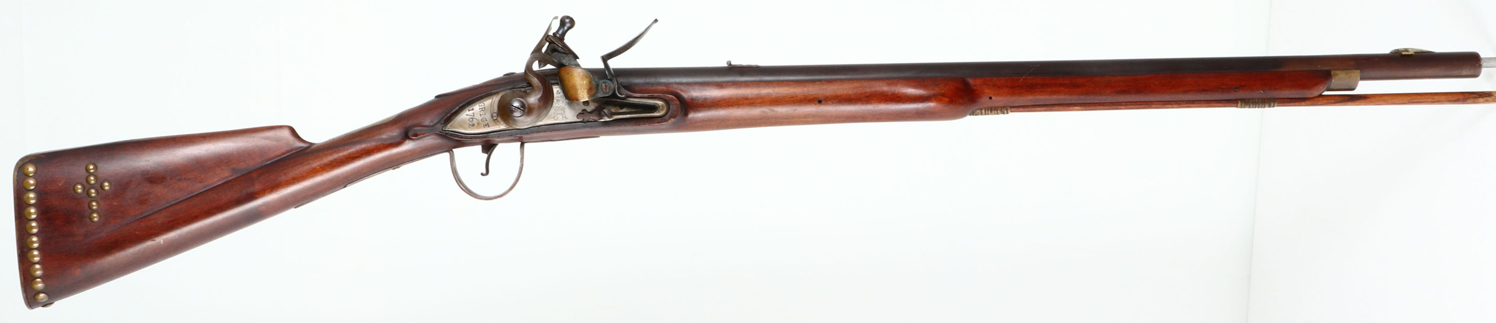 Davide Pedersoli, Brown Bess Reproduction, CAL: .54, MFG: 1970's- Present, S/N: N/A, Flintlock Muzzleloader, 30 1/2'' round barrel. The straight wrist wood stock is very good with nicks, ding, scratches, wear from use/ageThe mtal finish on the barrel rates 90% with light scratches. Lock plate is marked, ''GRICE'', ''1762'', Crown over ''G R''. Bore is very good bright with light roughness. Blade front sight, Fixed V-notch rear sight. Brass buttplate with wear & patina. Comes with ram rod. Muzzleloader, No FFL Req. - Value: 200 to 600