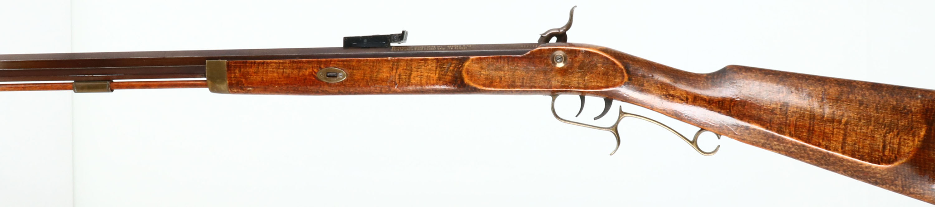Connecticut Vally Arms Inc., Hawken Rifle, Cal: .54, MFG; Modern, S/N: 856943, Percussion Muzzleloader, 28'' octagon barrel. The cheeked, straight wrist wood stock is excellent with little to no wear, trapdoor compartment on right side of stock. The metal has toned to a even brown patina, lock plate has nice floral engravings. Left side of barrel is marked ''CONNECTICUT VALLEY ARMS, INC HAWKEN RIFLE'', ''MADE IN SPAIN BLACK POWDER ONLY .54 CALIBER'', S/N, right side of barrel has proof mark. Bore is good, bright with strong rifling, light roughness & pitting. Bead front sight with U-notch rear sight. Brass crescent mood buttplate, set trigger does not work. Muzzleloader, No FFL Req. - Value: 100 to 300