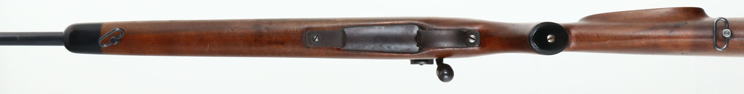 Kokura Arsenal, Model: Type 38, CAL: .308 WIN, MFG: 1935-41, SN: 31716, 25th serial block, Bolt Action Rifle, 24'' step-down barrel. Top of receiver carries the Chrysanthemum flower seal. Left side of barrel stamped ''WIN 308''. The cheeked & capped pistol grip wood stock, with black forend tip is very good, displaying contusions, scratches, scrapes & dings. There's a small glued edge chip repair behind the bolt & the right side of stock has a 1/2'' natural knot. The metal finish has toned to a mix of metal gray, brown patina & remaining blue. Bore is good, clean & bright, but with spots of roughness between strong rifling. The receiver holds a Lyman 575ME side mounted peep sight, while the barrel has a ramped blade front sight. Buttstock carries a ventilated recoil pad with a small missing chunk at the toe. Sling swivels. FFL or C&R Req. - Value: 250 to 500