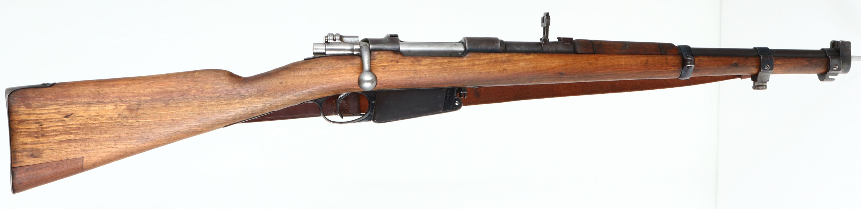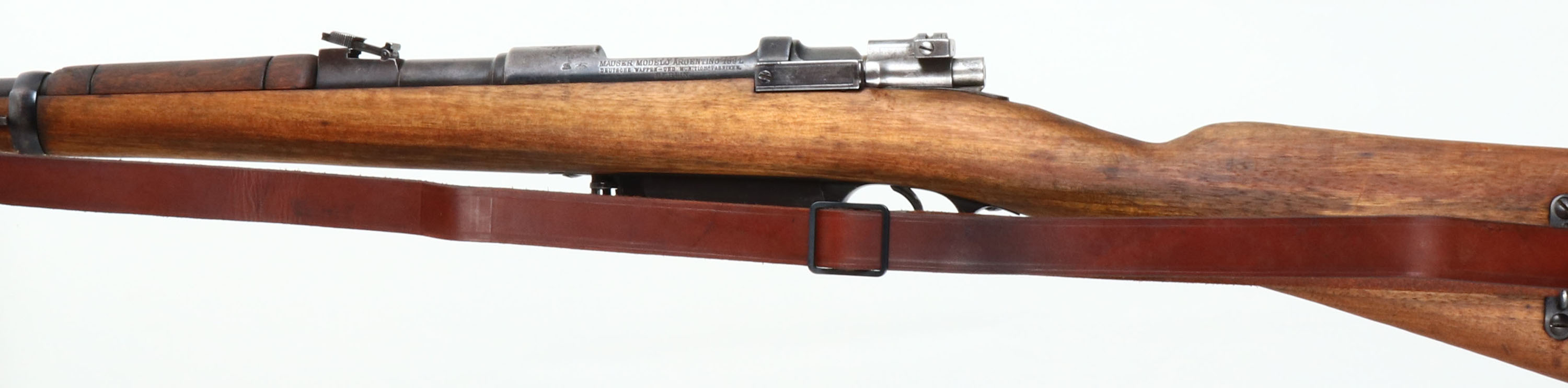 DWM, Argentino 1891 Engineers Carbine, CAL: 7.65x53mm, MFG: 1899, S/N: C2951, Bolt action rifle, 17 3/4'' barrel, The straight wrist wood stock is good, stock appears to have been sanded, replaced toe with wooden dowel securing. The metal on the barrel rates 60% with light scratches & areas worn gray near receiver, Receiver metal finish rates 20% with blue remaining in protected areas. Left side of the receiver is marked with proof marks, ''MAUSER MODELO ARGENTINO 1891'', ''DEUTSCHE WAFFEN-UND MUNITIONSFABRIKEN.'', top of receiver is marked with the Argentine coat of arms, right side of receiver is marked with S/N & importer marks, top of barrel has a proof mark, right side of barrel is marked with S/N, S/N matched bolt, magazine & barrel. Bore is very good, clean & bright with lightly thinned rifling. Barleycorn front sight with protective wings, V-notch ladder rear sight marked 4 to 14, metal buttplate with light patina. Side sling mounts. This rifle was originally made as a cavalry carbine, but in the early 1930's it was converted to a engineers carbine by adding a bayonet lug and side sling swivels, comes with leather sling. FFL or C&R Req. - Value: 500 to 1000