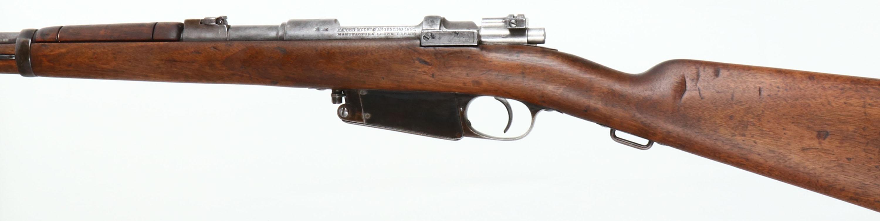 Loewe, Model: Argentino 1891 Cavalry Carbine, Cal: 7.65x53mm, MFG: 1895, S/N: A7022, Bolt action rifle, 17 3/4'' barrel, The straight wrist wood stock is very good with light nicks, dings, dents & wear from use/age, faint S/N mark on right side of stock by S/N on receiver, & it appears that it could match but most of the numbers are too faded to read, faint cartouche on top of upper handguard, faint cartouche on right side of stock by cheek weld. The metal on the barrel & receiver has toned to a even gunmetal gray with notes of patina. Left side of the receiver is marked with proof marks, ''MAUSER MODELO ARGENTINO 1891'', ''MANUFACTURA LOEWE BERLIN'', top of receiver is marked with a slightly worn but still visible Argentine coat of arms, right side of receiver is marked with S/N, top of barrel has a proof mark, right side of barrel is marked with S/N, S/N matched bolt & barrel. Bore is good, clean & bright with thinned rifling. Barleycorn front sight with protective wings, V-notch ladder rear sight marked 4 to 14, metal buttplate with light patina. bottom rear sling bar. Antique, No FFL Req - Value: 400 to 800