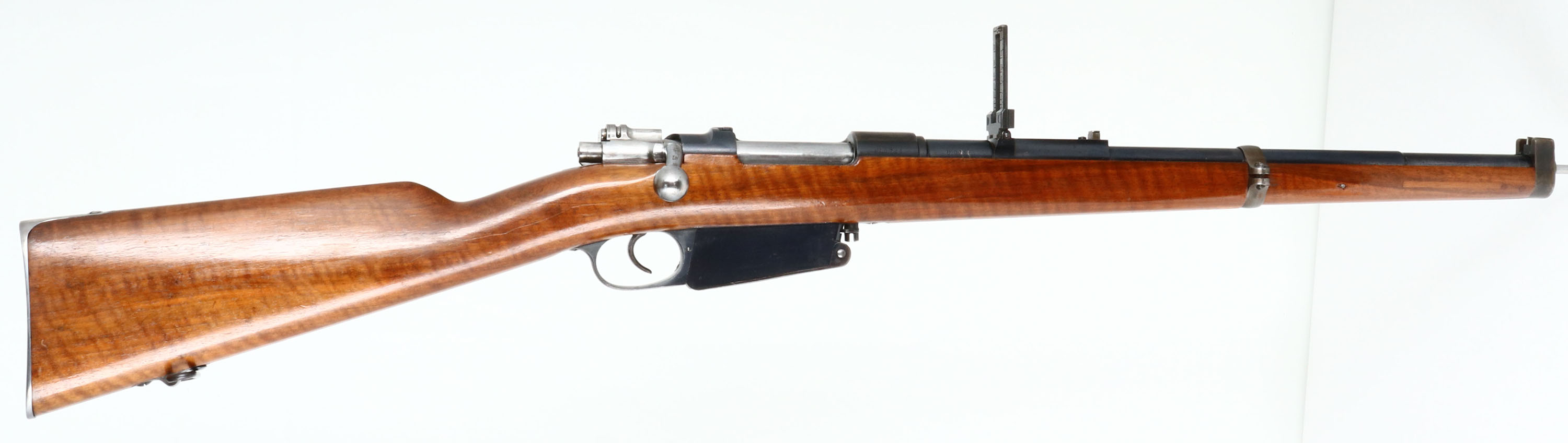 DWM, Model: 1891 Argentino, Cal: 7.65x53mm, MFG: 1900, S/N: U0756, Bolt action rifle, 17 3/4'' barrel, The straight wrist wood stock is good, 1/2'' by 1/2'' chip repair in bottom of stock right behind the rear barrel band, 2 1/2'' long tight repaired crack on bottom of stock emanating from front barrel band, crack also has wooden dowel reinforcements inlaid into the stock, two wooden dowl reinforcements inlaid into the bottom of the stock by rear sling mount, stock appears to have been sanded & re-finished, The metal finish rates 85% on the barrel with small spots of thinned bluing & light scratches, & 60% on the receiver, the spot were the coat of arms would have been has been ground down. Left side of the receiver is marked with proof marks, ''MAUSER MODELO ARGINTINO 1891'', ''DEUTSCHE WAFFEN-UND MUNITIONSFABRIKEN.'', ''BERLIN'', Right side of receiver is marked with S/N, top of barrel has a proof mark, right side of barrel is marked with S/N, S/N mismatched bolt, S/N matched barrel. Bore is excellent, bright with strong rifling. Barleycorn front sight with protective wings, U-notch ladder rear sight marked 4 to 20, metal buttplate with light patina. Bottom rear sling mount. This is a long rifle that has been cut down and made to look like a carbine. FFL or C&R Req. - Value: 250 to 500
