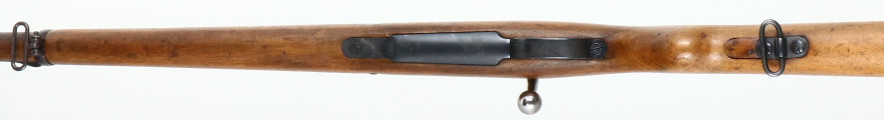 DWM, Model: Argentino 1909, Cal: 7.65x53mm Mauser, MFG: 1910, S/N: A4306, Bolt action rifle, 22 1/4'' barrel. The original semi-pistol grip wood stock is very good with light nicks, dings, dents, & wear from use/age, S/N marked into right side of stock just Infront of the recoil lug. The metal finish is a mix of original bluing with a few spots off added bluing, the finish rates 90% with light wear. Left side of receiver is marked ''MAUSER MODELO'', ''ARGENTINO 1909'', ''DEUTSCHE WAFFEN-UND'', ''MUNITIONSABRIKEN.BERLIN'', top of receiver is marked with the Argentina coat of arms, right side of receiver is marked with S/N, right side of barrel behind barrel band has a light stamp that reads ''765'', S/N matched Bolt & trigger guard. Bore is very good, strong rifling with light roughness. Barleycorn front sight, V-notch tangent rear sight marked 2 to 14. Metal buttplate with light wear. Bottom sling mounts, comes with cleaning rod. FFL or C&R Req - Value: 300 to 600