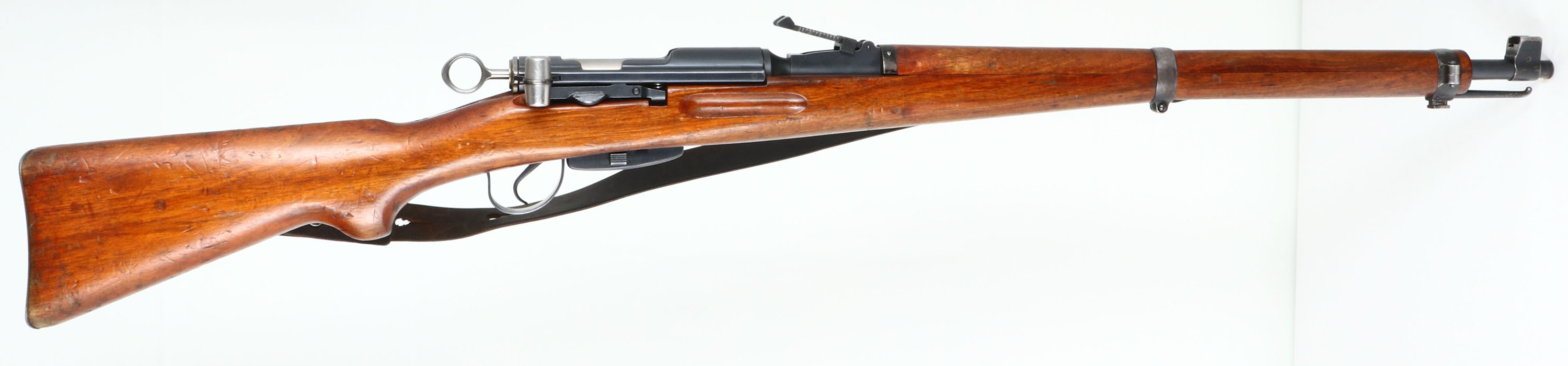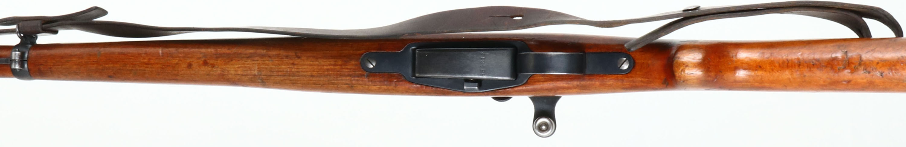 Waffenfabrik Bern, Model: K31 Short Rifle, Cal: 7.5x55mm Swiss, MFG: 1953, S/N: 689816, Straight pull Rifle, 25 3/4'' Barrel. The semi-pistol grip wood sock is very good with light nicks, scratches, ding dents & wear from use/age, Swiss crest on right side of stock by cheek weld. The metal finish rates 85% overall with spots of thinned bluing. Left side of receiver is marked with S/N & importer marks, top of receiver is marked with Swiss crest, top of barrel is marked, ''816'', ''BP'', & other proof marks, S/N Matched Bolt, barrel, & magazine. Bore is excellent, bright with minor wear. Blade front sight with protective wings, U-notch tangent rear sight marked 1 to 15. Metal buttplate with minor wear, Side sling mounts, comes with a original Swiss K31 leather sling. FFL or C&R Req. - Value: 400 to 800