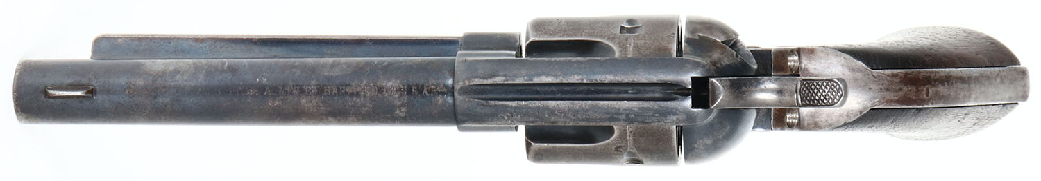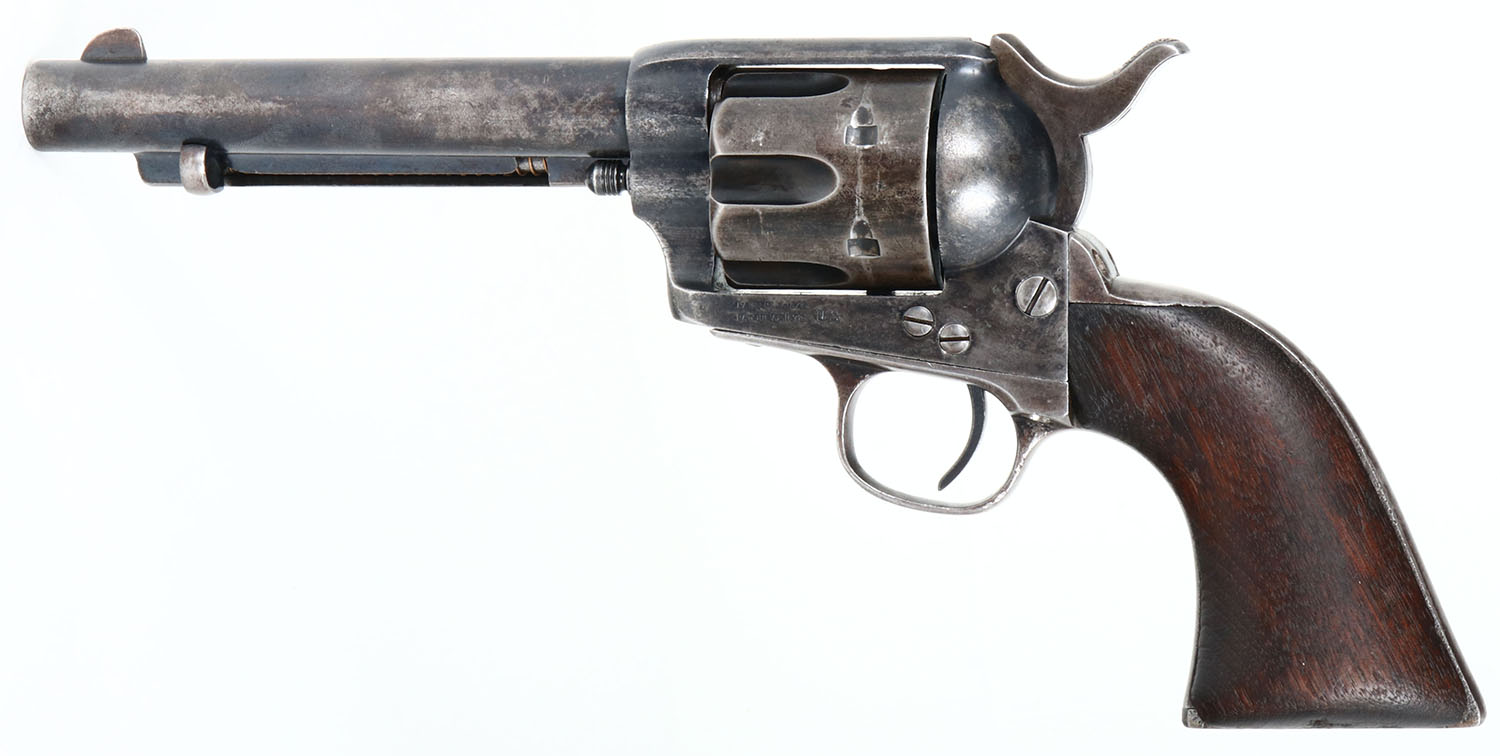RARE Colt, SAA, 8th Cavalry U.S Artillery Revolver, CAL: 45 LC, MFG: 1874 (frame SN), SN: 10709, Single Action Revolver, 5 1/2'' barrel. 2nd year production. Records from Springfield Research Service list remaining information on revolvers SN#'s 10695 & 10715. These revolvers were issued to Troop C of the 8th U.S. Cavalry in 1876. They served in NV, OR, AZ, NM & TX during the Indian Wars between 1867 & 1888. This pistol's SN falls between these two revolvers & likely had the same history. Although not marked, or no longer visible, Ainsworth inspected these first of the U.S. Colt SAA revolvers, which were later converted, as seen only through SN 14998 & rarely encountered today. These guns were frequently rebuilt in arsenals & therefore are rarely encountered with matching SN's. The top of the barrel is stamped ''COLT'S PT. F.A. MFG. Co HARTFORD, CT. U.S.A.'', the left side of the frame is marked with a two line patent dates ''PAT. SEPT. 19, 1871, JULY. 2, 1872'', followed by the U.S. ownership stamp. The frame is stamped ''10709'', the trigger guard is stamped ''95821'' over ''G'', the butt is also stamped ''95821'' over ''G''. Any stampings on the bottom of the grips are no longer visible''. The wood grips are very good, as lightly sanded & reoiled. There are tiny corner & edge chips & other very minor contusions & scrapes. The metal blue finishes remains in more protected areas at 30%, with the rest worn gun metal gray, with a thin brown patina. Bore is excellent, with minor spotting & speckling. The barrel carries a blade front sight & the frame has an integrated rear groove. Action is tight & smooth, with the cylinder timing correctly functioning properly. The Colt Single Action Army is a worldwide icon of the U.S. & the Western Frontier. Wielded by the long arm of the law, military & bad men, the famous Single Action Army became well-known as the Peacemaker. This Artillery model & likely 8th Cavalry example is a top level SAA collectible.* Antique, No FFL Req. - Value: 5000 to 10000