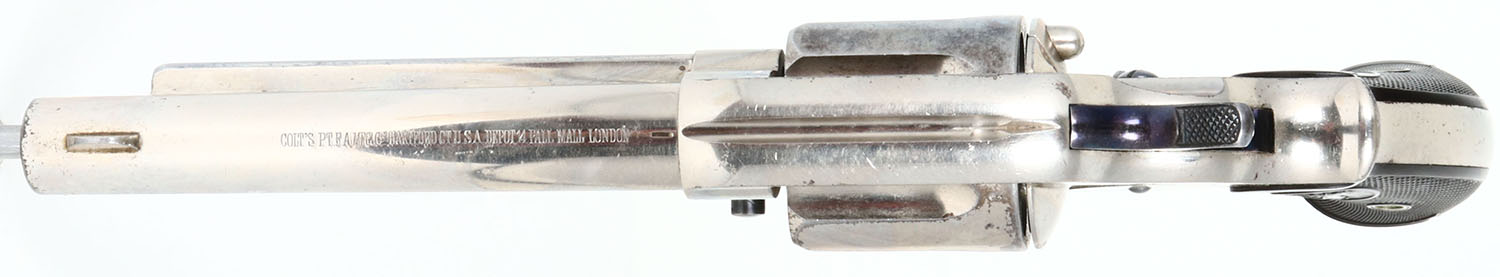 RARE Colt, Model 1878, ''PALL MALL'' Stamping, CAL: .476 ENFIELD, MFG: 1885, SN: 15744, Double Action Revolver, 5 1/2'' barrel. The top of the barrel has the rare marking ''COLT'S PT. F.A. MFG. CO. HARTFORD CT. U.S.A. DEPOT 14 PALL MALL LONDON''. The bottom is marked with two British proof marks. The cylinder has British proofs at the rear of each flute. The left side of the trigger guard is marked ''.476 CAL'' The loading gate & left side of backstrap is marked with assembly numbers ''567''. The full SN can be found on the butt, ahead of the lanyard loop. The Rampant Colt checkered hard rubber grips, with smooth borders, wedge-shaped smooth base are excellent. The nickel metal finish is very good with some spotting & speckling. Oxide blued trigger & hammer. Bore is very good & bright. The barrel holds a blade front sight. Lanyard swivel loop present. The .476 Enfield cartridge would have been more popular in England during the 1880's & 90s than most of Colts other offerings. The Pall Mall barrel address & Enfield chambering is more scarce than many other variations making it fairly rare & collectible. This revolver would make a great addition to any Colt or British revolver collection. Antique, No FFL Req. - Value: 1500 to 2500