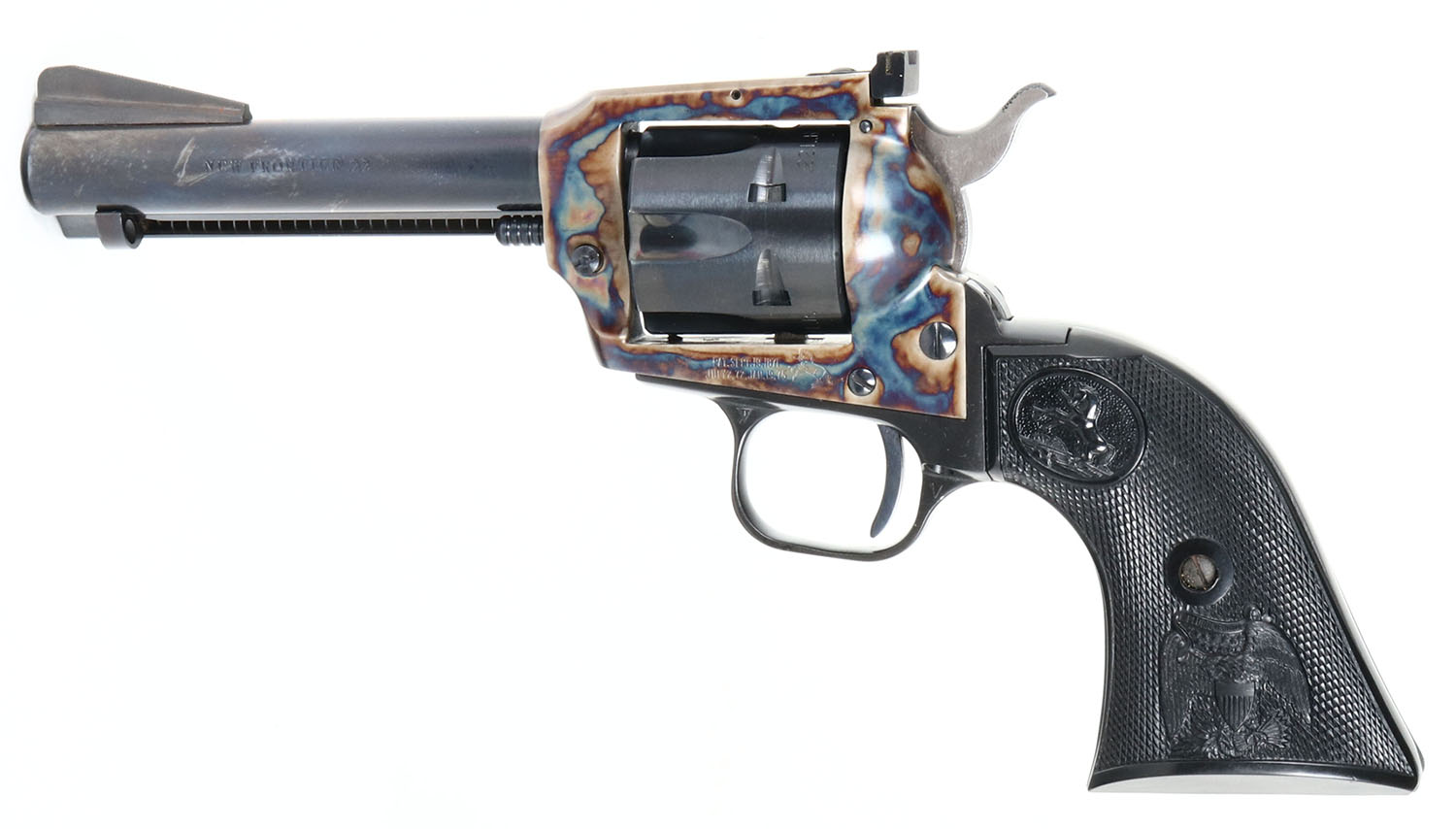 BOXED, Colt, New Frontier 2nd Gen, CAL: 22 LR/22 MAG, MFG: 1972, SN: G55740, Single Action Revolver, 4 3/8'' barrel. The E. Pluribus Unum & Rampant Colt checkered black plastic grips are excellent. The metal blue finish on the barrel, cylinder & trigger guard is 99%. The frame is case-hardened, retaining full case-colors. Bore is excellent. The frame holds an adjustable rear sight & large ramp blade front sight. Comes in original box, with paperwork, three prong Colt tool & seperately boxed 22 MAG cylinder. A high condition example of a 2nd Gen Colt revolver. FFL or C&R Req. - Value: 600 to 1200