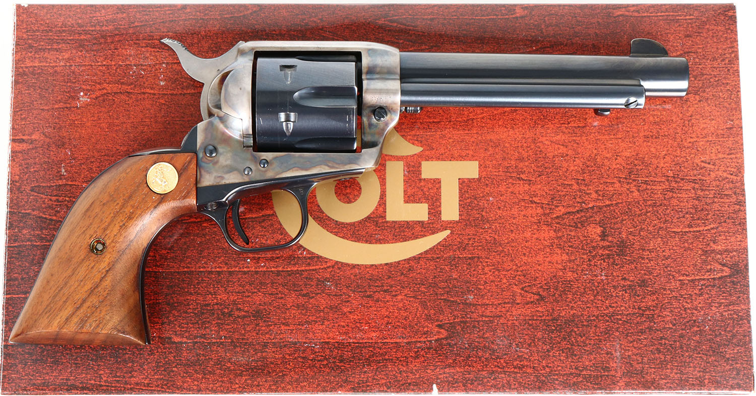 BOXED Colt, Single Action Army (P1850), CAL: .44 Special, MFG: 1978-93, SN: SA32699. Single Action Revolver, 5 1/2'' barrel. The top of the barrel is marked ''COLT'S PT F.A. MFG. CO. HARTFORD CT. U.S.A.'', The left side of the barrel is marked ''COLT SINGLE ACTION ARMY 44 SPECIAL''. The left side of the frame is marked with the Rampant Colt logo above the trigger guard & next to patent dates. The full SN can be found on the frame. The original Rampant Colt medallion & wood grips are excellent. The factory metal blue finishes rate 99%. The case-hardened frame displays vivid case-colors. Bore is excellent & bright. The barrel holds a blade front sight. Comes in the reproduction wood grain box. FFL Req. - Value: 1400 to 2200