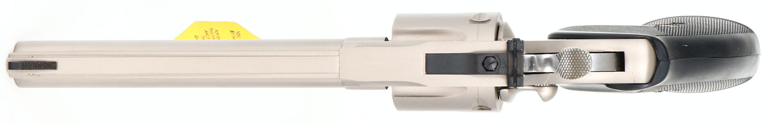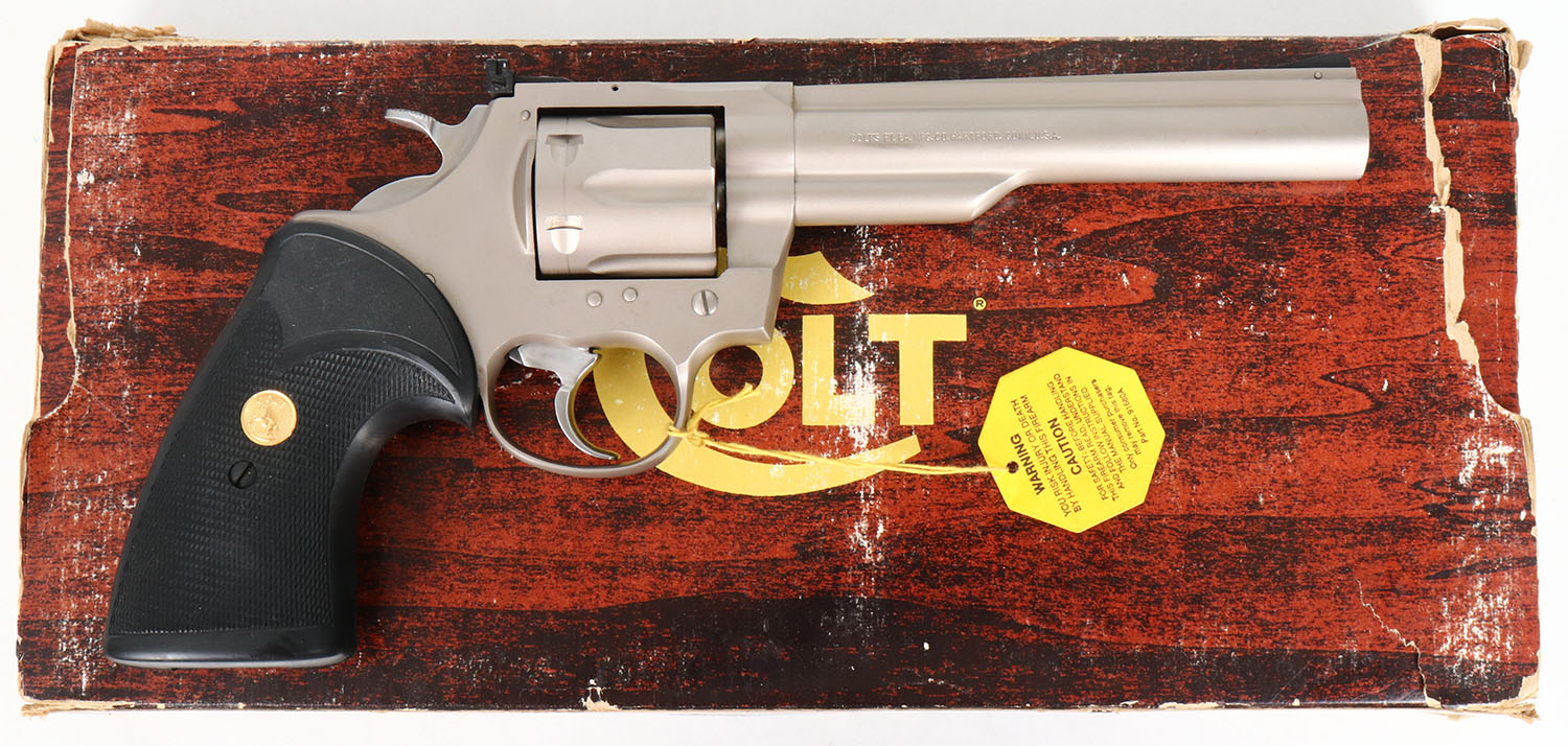 BOXED, Colt, Trooper MK III, CAL: .22 LR, MFG: 1981, SN: Y40996, Double Action Revolver, 6'' barrel. The Colt Trooper MK III was introduced in 1969, in caliber 22LR, 22 WMR, 357 MAG or 38 SPL. This example is very desirable, chambered in .22 LR, which according to the Blue Book brings an additional 30% premium. The left side of barrel is stamped in two lines, ''TROOPER MK III .22 LONG RIFLE''. The gold Colt medallion checkered rubber grips are minty. The E-Nickel (Electric Nickel) finish is mint. Bore is mint. The frame holds a ''U'' notch rear sight & blade sight. Hanging tag still on gun. This gun comes in the original box, with owners manual. Comes with the colt purchase letter from Colt President, in the original SN matching wood grain box, with packaging, owners manual & paperwork. Box has storage wear, tears & split seams, with end flaps having been taped. FFL Req. - Value: 1000 to 2000