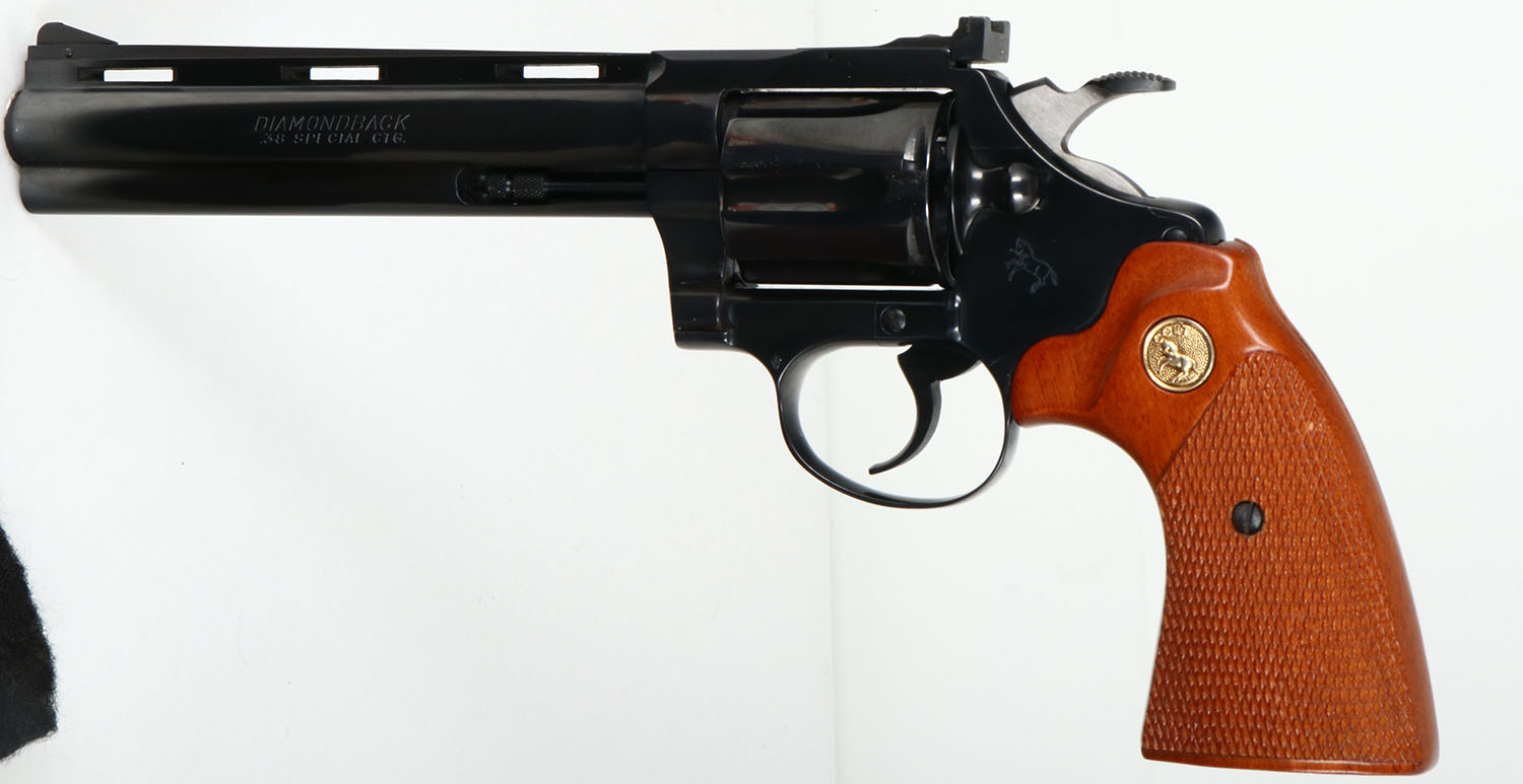 BOXED, Colt, Model Python, (D5560) CAL: .357 Magnum, MFG: 1975, SN: S78555, Double Action Revolver, 6'' barrel. The Colt Python was introduced as a premium model in 1955, in caliber .357 Magnum. The Python is built on the large I-frame & has a reputation for accuracy, smooth trigger pull, & a tight cylinder lock-up. It has a 6-shot swing-out cylinder & was available in Python blue, Royal blue, Python nickel & Python stainless steel finishes. Some firearm collectors & writers have described the Python as ''the finest production revolver ever made''. It has a wide serrated target hammer, ventilated rib, & fully adjustable target quality rear sights. The left side of barrel is stamped ''PYTHON 357 * .357 MAGNUM CTG * ''. The Rampant Colt gold medallion, checkered walnut grips on this example are mint. The high polish blued finish is near mint. Bore is mint. The satin finished top of the ventilated rib barrel holds a screw height adjusting ''U'' notch rear sight & front blade sight. This gun comes in its original Colt wood grain box, with instruction manuals. Basically NOS, & very collectible when found in this condition. FFL Req. - Value: 2500 to 3000