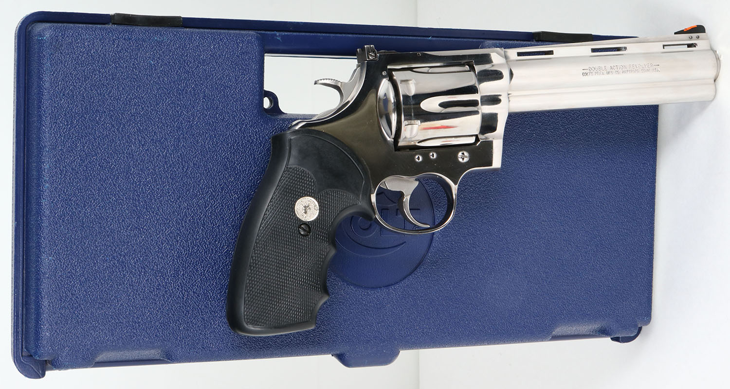 CASED, Colt, Anaconda, BTS, CAL: .44 Magnum, MFG: 1997, SN: MM95918, Double Action Revolver, 6'' barrel. The Colt Anaconda was introduced in 1990, in caliber 44 Mag & 45 Colt to compete in the popular large-bore Magnum pistol market. The Anaconda was built on the new & heavier large ''MM''-frame & was initially only produced in stainless steel as standard, with different Special order finishes available. The left side of barrel is stamped ''COLT ANACONDA -- 44 MAGNUM -- ''. The Colt marked textured rubber grips are excellent. The rare mirror high polish stainless (BTS) finish is excellent. Bore is minty. The frame holds a white outline ''U'' notch rear sight & front blade sight, with orange insert. This gun comes in an original Colt blue plastic case, with instruction manual. FFL Req. - Value: 2000 to 3000
