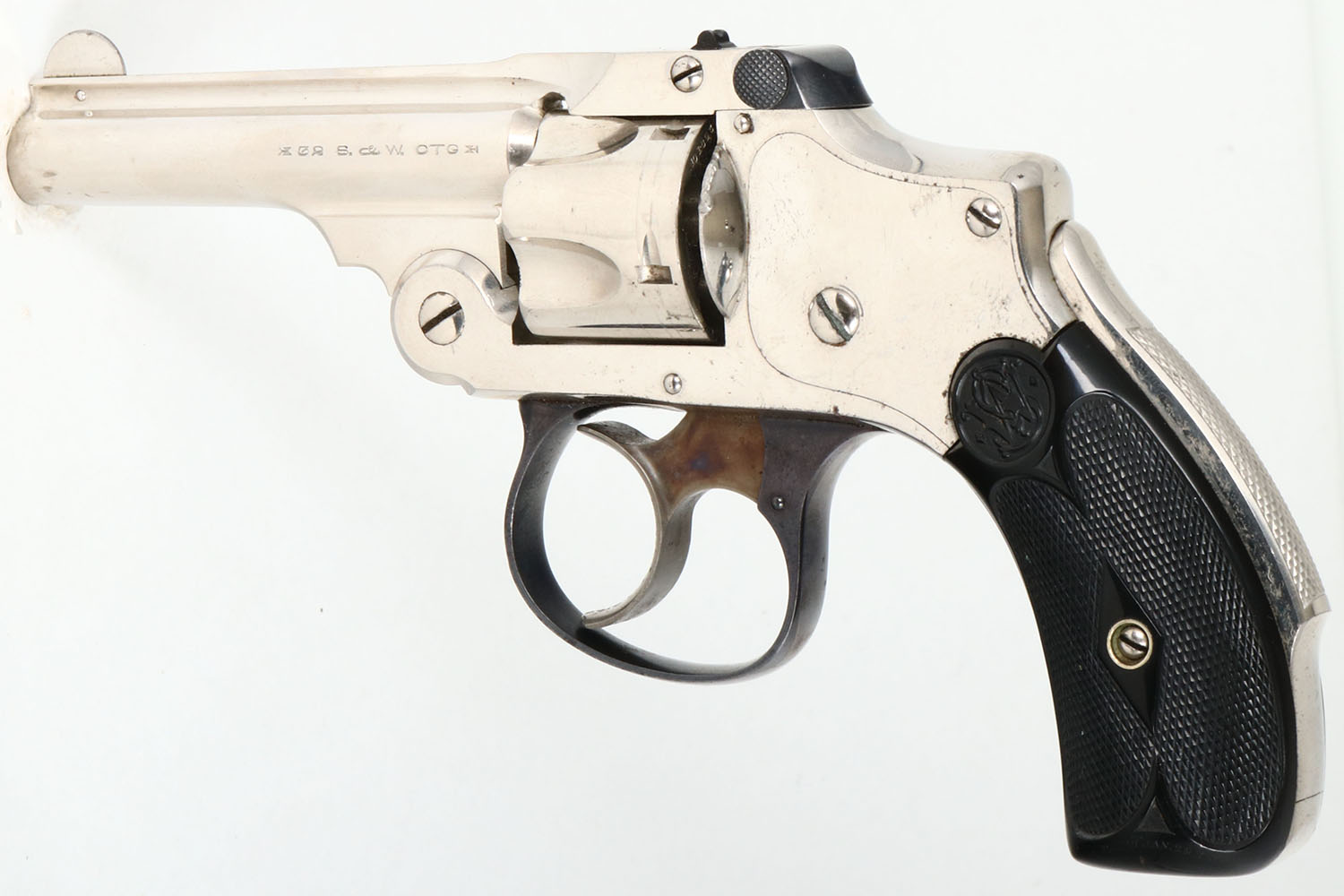 Smith & Wesson, Safety Hammerless, 2nd Model ''Lemon Squeezer'', CAL: 32 S&W, MFG:1902-09. SN: 101893, Double Action Revolver, 3' barrel. The S&W logo checkered hard rubber grips are excellent. The nickel finish is excellent, retaining full coverage, with some thin brush lines & light speckling. The trigger guard is blued & trigger is case-hardened. Bore is very good & bright, but with some spotty areas of light roughness. The barrel holds a pinned blade front sight & an adjustable small notch rear sight. A very nice example of a lemon squeezer. FFL or C&R Req. - Value: 300 to 600