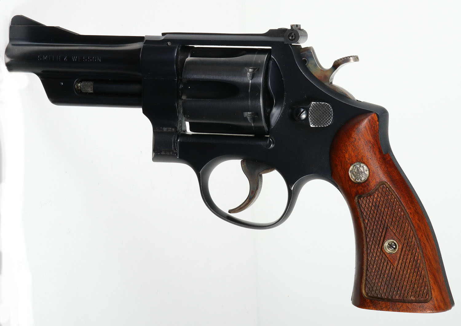 Smith & Wesson, Model 28 Highway Patrolman, 4 Screw, CAL: 357 MAG, MFG: 1961, SN: S214831, Double Action Revolver, 4'' barrel. The left side of the barrel is marked ''SMITH & WESSON''. The right side of the frame is marked with the S&W trademark logo & the standard four line address stamp. The right side of the barrel is marked ''357CTG * HIGHWAY PATROLMAN''. The S&W logo silver medallion & checkered diamond grips are excellent. The metal blue finish rates 99%, with a faint drag line on the cylinder. The trigger & hammer are case-hardened, retaining full case-colors. Bore is excellent. The frame holds an adjustable rear sight & ramp elevated blade front sight. A very high condition & desireable Model 28. FFL or C&R Req. - Value: 1000 to 1600