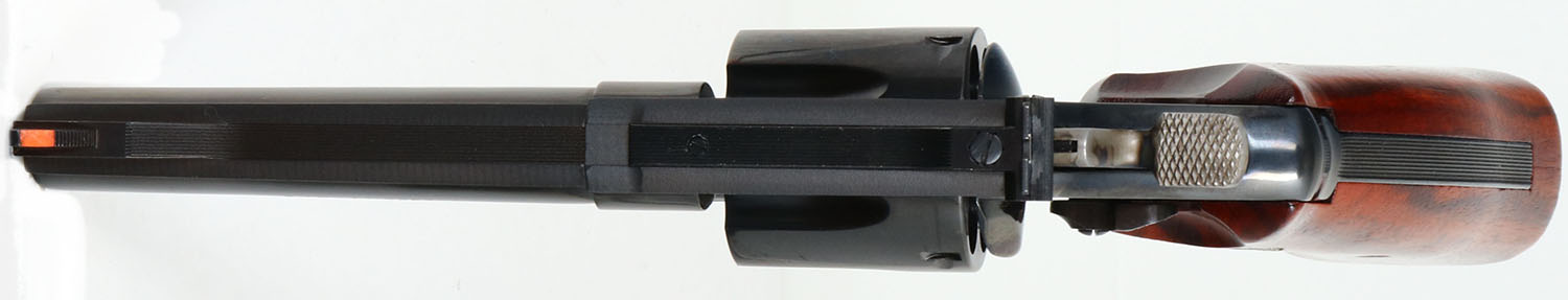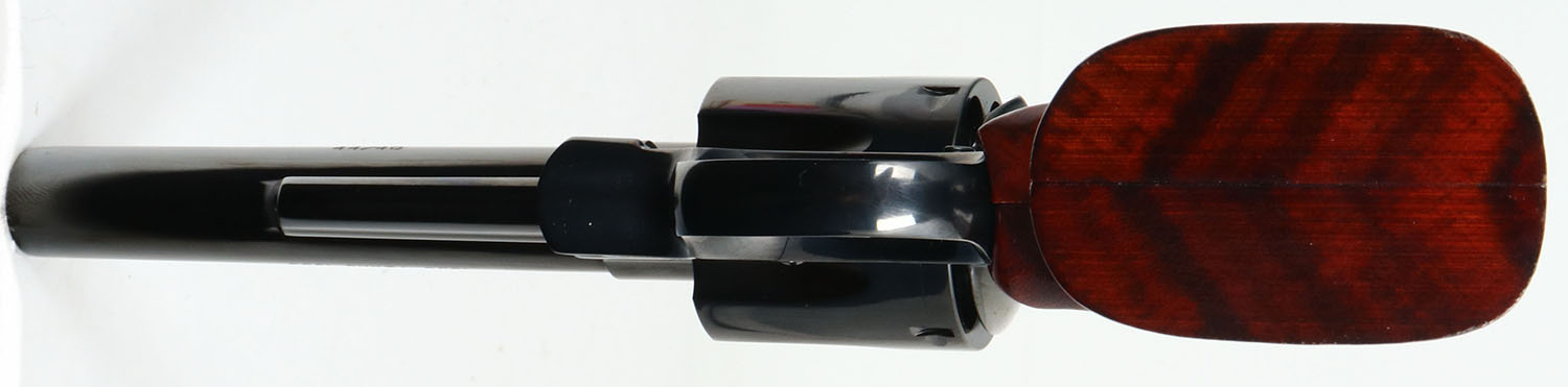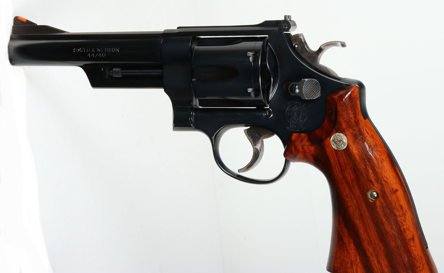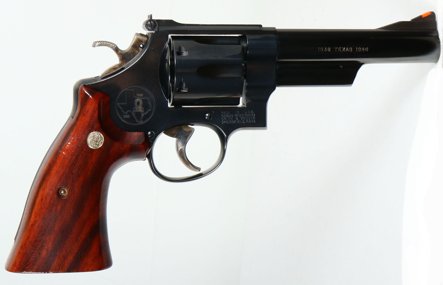 CASED, Smith & Wesson, Model 544 ''Texas Wagontrain Commemorative'', CAL: 44-40, MFG: 1986 ONLY, SN: 7918X, Double Action Revolver, 5'' barrel. The right side of the frame is marked with the Texas Wagontrain Commemorative seal & the standard four line address. The right side of the barrel is marked ''1836 TEXAS 1986''. The left side of the barrel is marked in two lines ''SMITH & WESSON 44/40'' & the left side of the frame, above the grip has the S&W trademark logo. The S&W medallion smooth grips with high gloss finish are excellent. The metal blue finish rates 98% overall. The trigger & hammer are case-hardened, retaining full case-colors. Bore is excellent. The frame holds an adjustable rear sight & blade front sight, with orange insert. Comes in original commemorative wood case, with blue velvet interior. They produced these revolvers one year & only made 4,782. FFL Req. - Value: 1000 to 2000