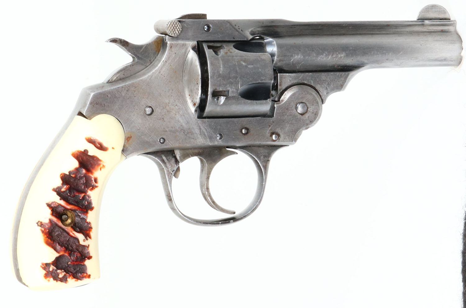 Iver Johnson, Top Break Revolver, CAL: 32, MFG: N/A, SN: 56683, Double Action Revolver, 3'' barrel. The faux stag grips are excellent. The bottom of the right grip has a very small edge chip. The metal blue finish has been buffed to metal grey, with remnants in protected areas. Bore is excellent, with intermittent roughness. Notch & blade sights. FFL or C&R Req. - Value: 100 to 250