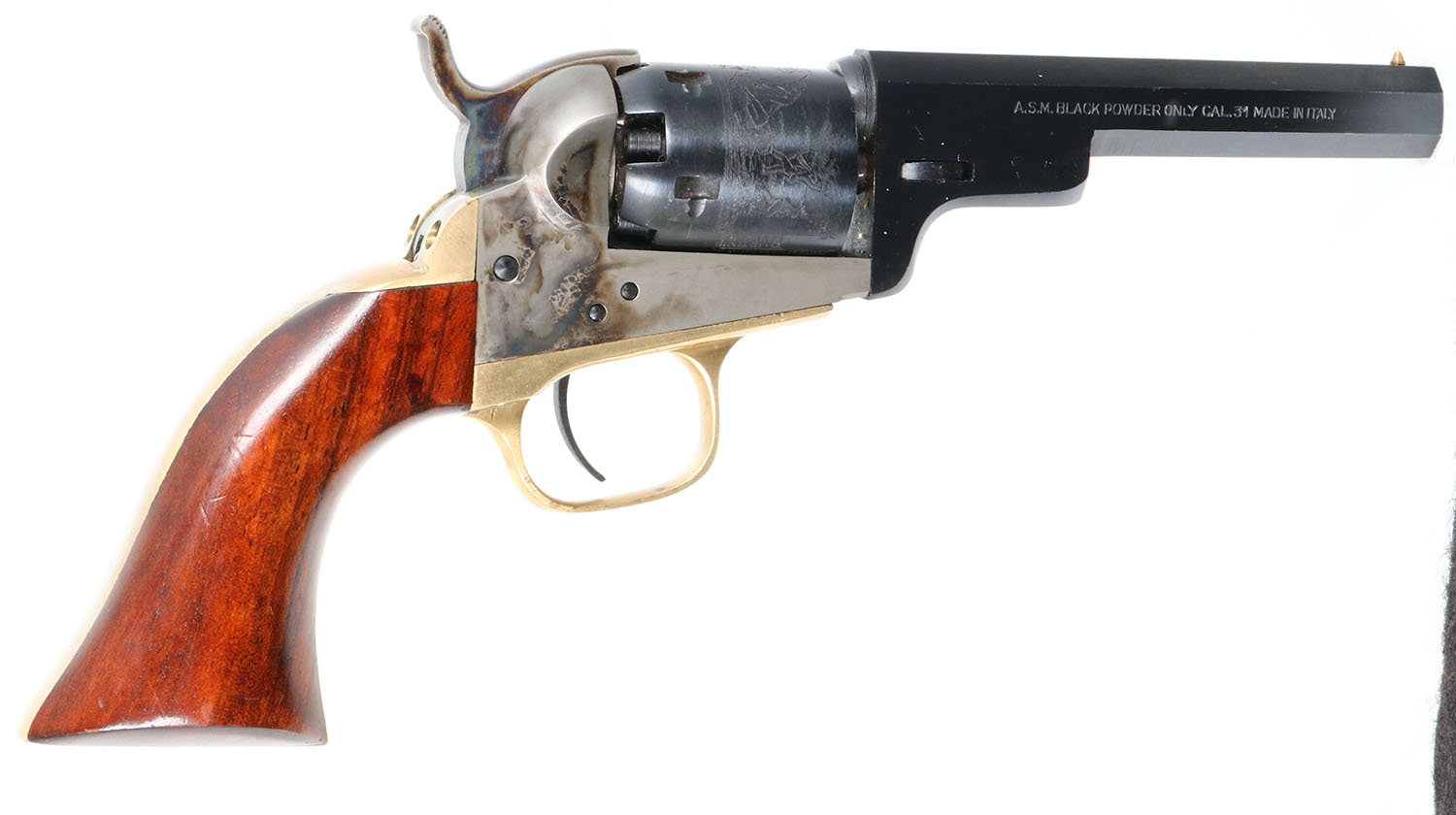 ASM, 1849 Pocket Replica, CAL: 31, MFG: Modern, SN: D86964, Single Action Black Powder Revolver, 4'' barrel. The wood grips are excellent, with minor handling marks. The cylinder displays a stagecaoch scence. The metal blue finish on the barrel & cylinder rates 98%. The frame & hammer are case-hardened. The frame has worn to metal grey, with cas-color shadows remaining & the hammer still has vivid case colors. The trigger guard & backstrap are polished brass. Bore is excellent. The barrel holds a small inverted cone front sight. Black Powder, No FFL Req. - Value: 150 to 350
