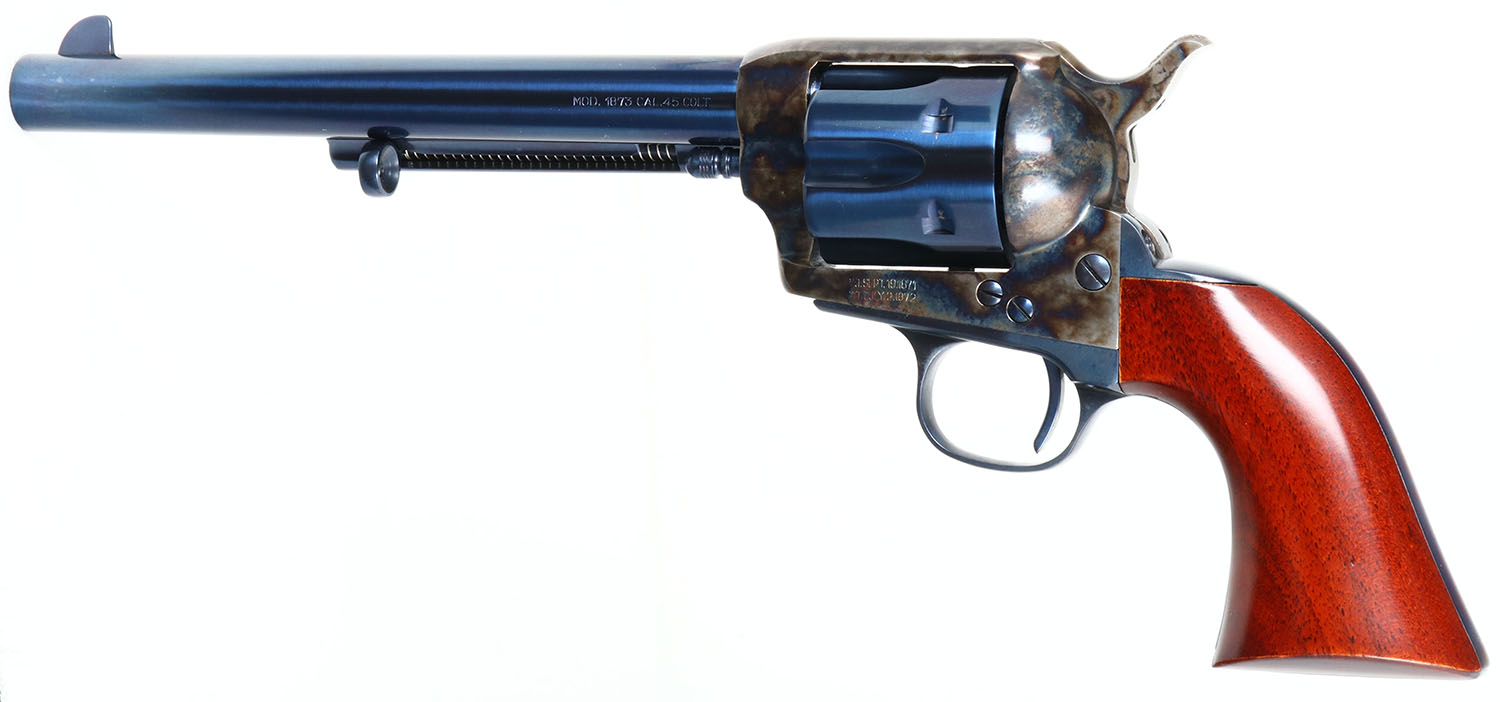 CASED, A. Uberti, Model 1873 Cattleman, CAL: 45 COLT, MFG: Modern, SN: UC6341, Single Action Revolver, 7 1/2'' barrel. The wood grips are excellent. The charcoal-blue metal finish on the barrel, cylinder & trigger guard is excellent, rating 99%+. The frame & hammer are case-hardened, retaining full case-colors. Bore is excellent. Groove & blade sights. Comes in a custom wood case, with red interior. Included in the case is paperwork, a cleaning kit in a orange metal container, (6) snap caps, lock/key & case keys. FFL Req. - Value: 700 to 1000