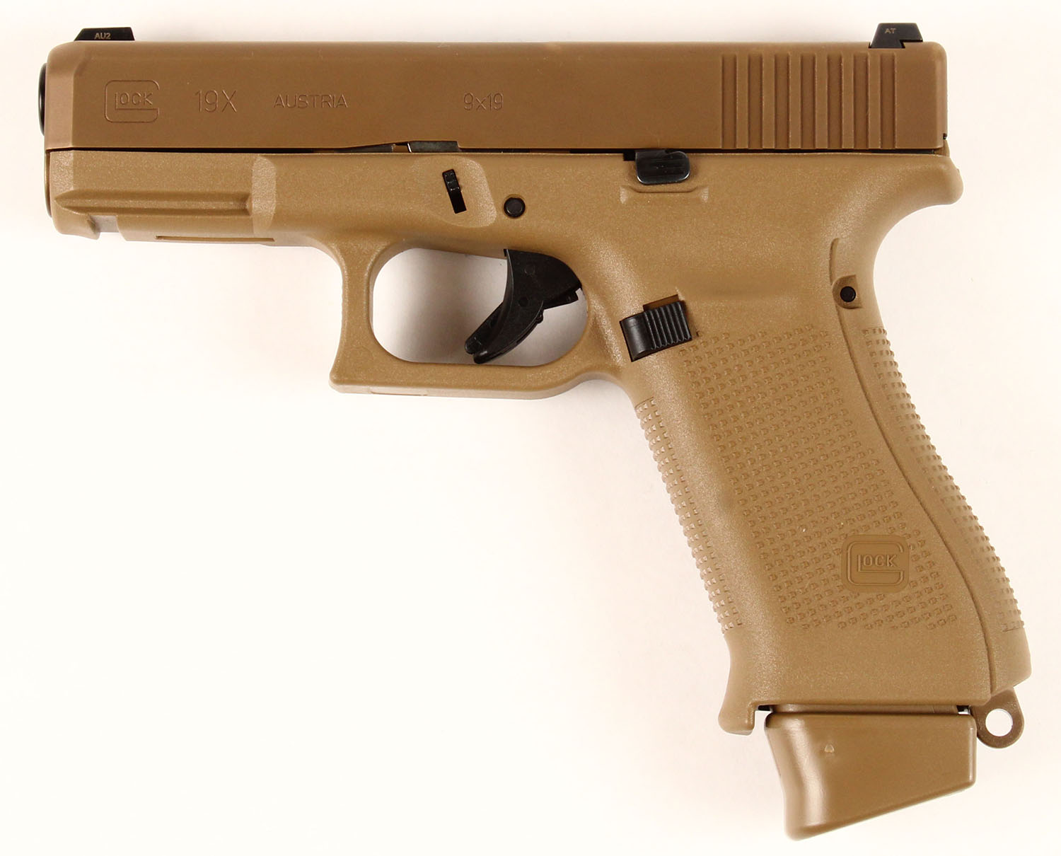 NEW CASED, Glock, Model 19X GEN 5, CAL: 9mm (9x19), MFG: Modern, Semi-Auto Pistol, 4'' barrel. The polymer frame & grips are mint. The Coyote nPVD coated slide is mint. Bore is mint. Factory rear two dot night sight & front dot night sight. Comes in the original factory case with owners manual, lock/key, cleaning rod/brush, grip attachments, (3) 17rd mags & speed loader. NOS. FFL Req. - Value: 600 to 750