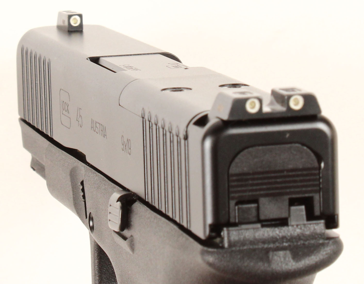 NEW CASED, Glock, Model 45 Gen 5 MOS, CAL: 9mm, MFG: Modern, Semi Auto Pistol, 4'' barrel. The textured polymer grip & frame are mint. The factory matte black finish is mint. Bore is mint. Factory rear two dot night sight & front dot night sight. Comes in factory hard case, with owners manual, lock/key, cleaning rod/brush, grip attatchments, Glock MOS Adapter Set 01, (3) 17rd mags & speed loader. NOS. FFL Req. - Value: 500 to 650