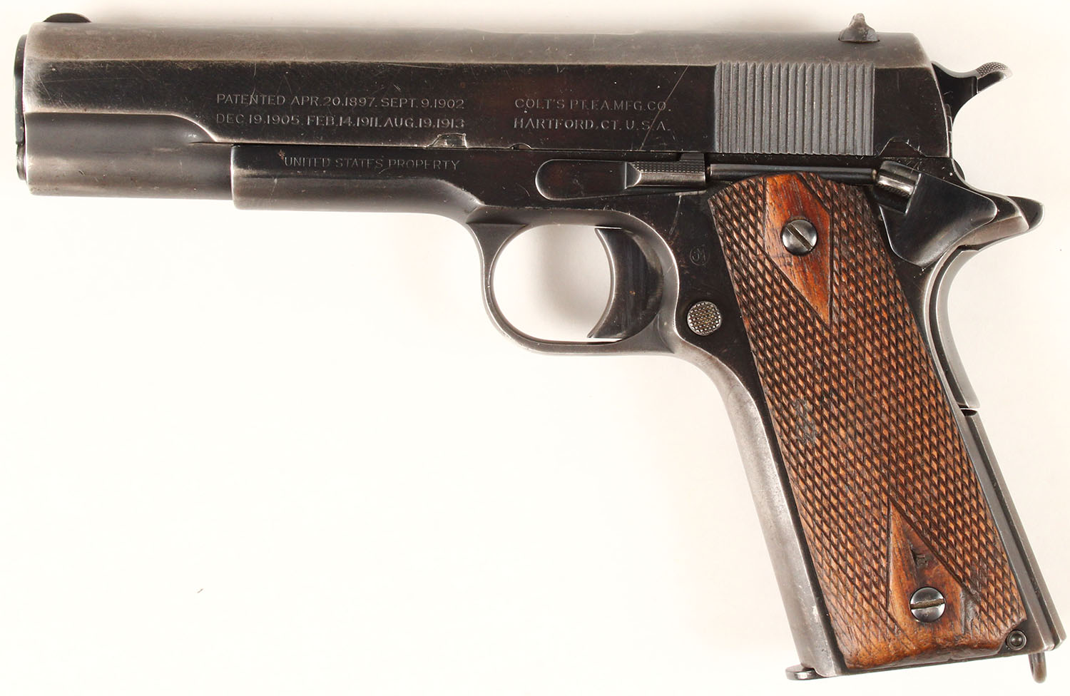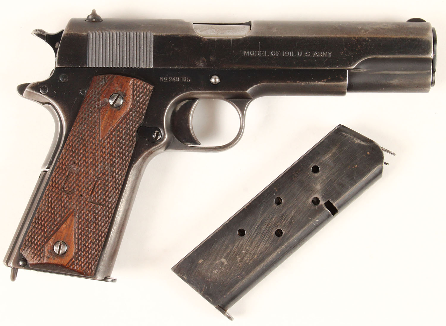 WWI Era Colt, Model 1911- U.S. ARMY, CAL: 45 ACP, Semi-Auto, MFG: 1918, WWI era, SN: 248105, 5'' barrel. This pistol is fitted with the double diamond checkered walnut grips, which are very good, with minor contusions. The right grip is stamped with 1/2'' initials of a backwards ''J'' & a normal ''L''. It has the two-line, two-block Colt factory address & patent dates markings of ''PATENTED APR.20.1897. SEPT.9.1902. DEC.19.1905. FEB.14.1911. AUG.19.1913'' followed by ''COLT'S PT.F.A. MFG. CO. HARTFORD.CT.U.S.A.''. The left side of the frame is stamped ''UNITED STATES PROPERTY''. The right side of the slide is stamped ''MODEL OF 1911. U.S. ARMY''. The right side of the small SN markings of ''No. 248105'', with the circled ''JM'' monogram of Ordnance Inspector above the magazine release. The rear face of the slide, as well as the top of the receiver, are all correctly stamped with the ''H'' provisional inspection mark of Frank L. Hosmer, the U.S. Government inspector who started inspecting these at approximately pistol SN ''400''. The pistol comes with two magazines, one marked ''COLT 45 AUTO'', the other unmarked. The extra unmarked mag had rust pitting that was scrubbed. There is a lanyard loop on the underside of the strap base. The metal blue finish is 70% overall, with most of the wear to the straps & forward portion of slide. The bore is very good, with spotty areas of light roughness. Appears mechanically sound. This is a very nice U.S. ARMY Colt Model 1911 semi-automatic pistol. FFL or C&R Req. - Value: 1500 to 3000