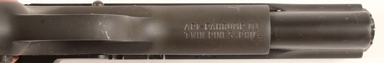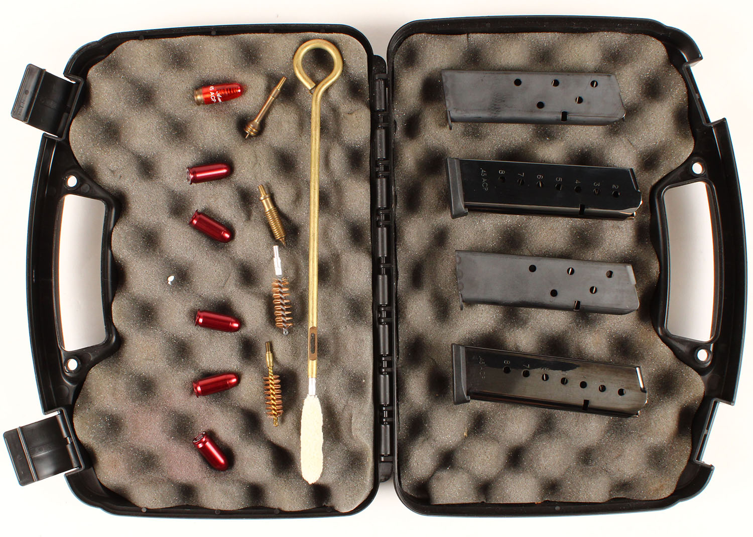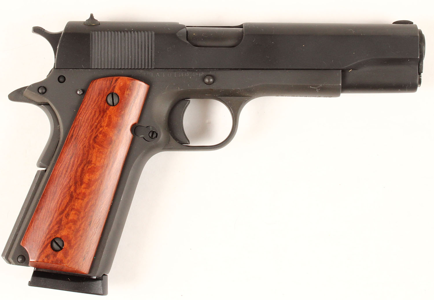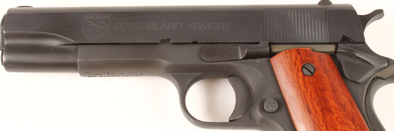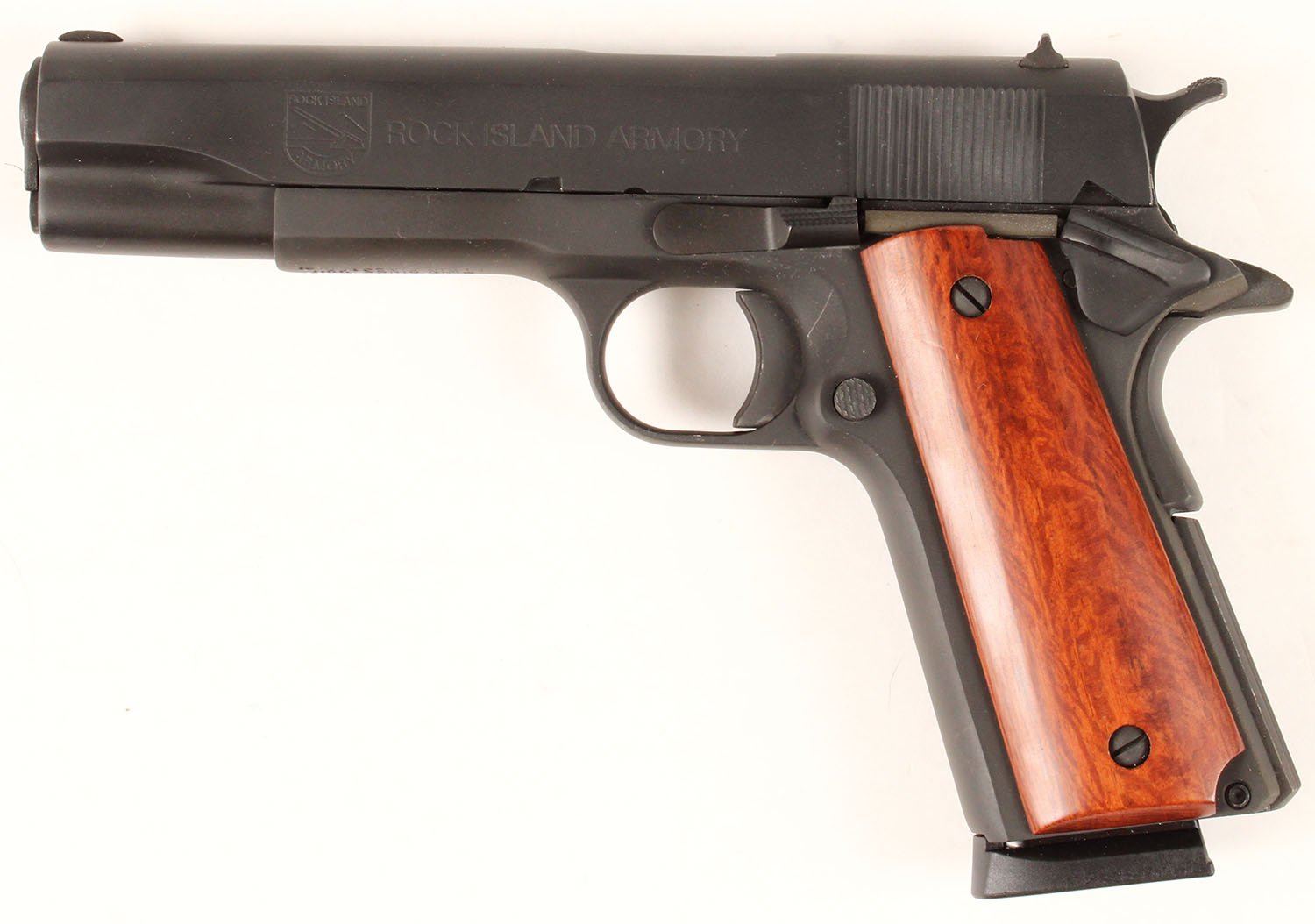 CASED, Rock Island, Model M1911, CAL: 45ACP, MFG: Modern, SN: RTA1018039, Semi-Auto, 5'' barrel. The plastic wood grain grips are excellent, with minor handling marks. The matte black finish on the frame & slide rates 98%. Bore is excellent, with light visible wear. Comes in original hard case, with four mags, cleaning rod, cleaning brushes, snap caps, paperwork, lock & key. FFL Req. - Value: 400 to 600