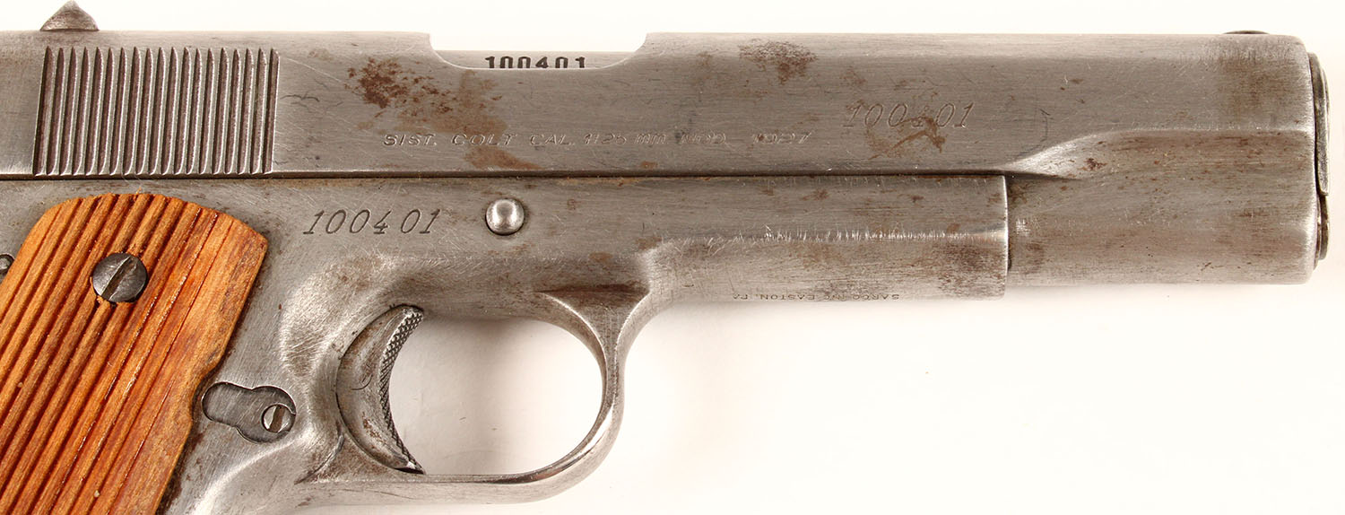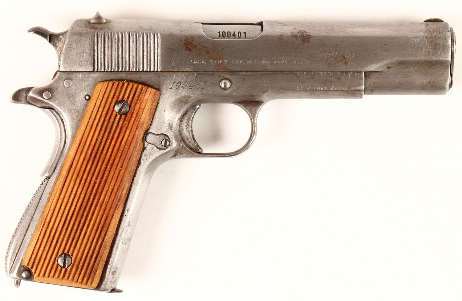 D.G.F.M - (F.M.A.P), Model 1927, CAL: 45ACP (11.25mm), MFG: 1958, SN: 100401, Semi-Auto Pistol, 5'' barrel. The left side of the slide is marked ''D.G.F.M - (F.M.A.P)'' & the right side of the frame is marked ''SIST. COLT CAL 11.25mm MOD 1927''. The full SN is marked on the right side of the frame, twice on the slide & the barrel. The grooved wood grips are excellent. The entire gun has been buffed to gun metal grey, with spots toned to brown patina. Bore is excellent, but appears grainy. Factory fixed notch & blade sights. Comes in plain cardboard box, with extra spring. Box is aged. FFL or C&R Req. - Value: 400 to 600