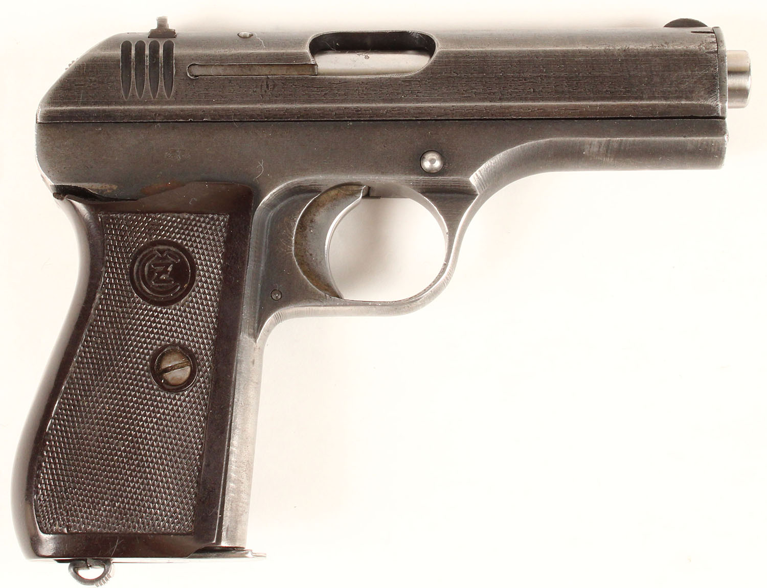 Bohmische Waffenfabrik, Model: VZ 27 (P.27), Cal: 7.65 (32 ACP), MFG: 1939-45, S/N: 244577, semi auto pistol, 4'' barrel. The plastic checkered grips are good with chunk missing at the top of right grip, & scratches & wear from use/age. The metal finish rates 65% overall with finish remaining in most areas just thinned & worn. Left side of slide is marked ''Pistole Modell 27'' ''Kal. 7,65'', top op slide is marked ''BOHMISCHE WAFFENFABRIK A. G.IN PRAG'' & S/N, right side of frame is marked with a Waffenamt proof mark. Bore is excellent, bright & mirror like with no roughness. Blade front sight, V-notch rear sight. Comes with aftermarket holster & spare mag. FFL or C&R Req - Value: 400 to 800