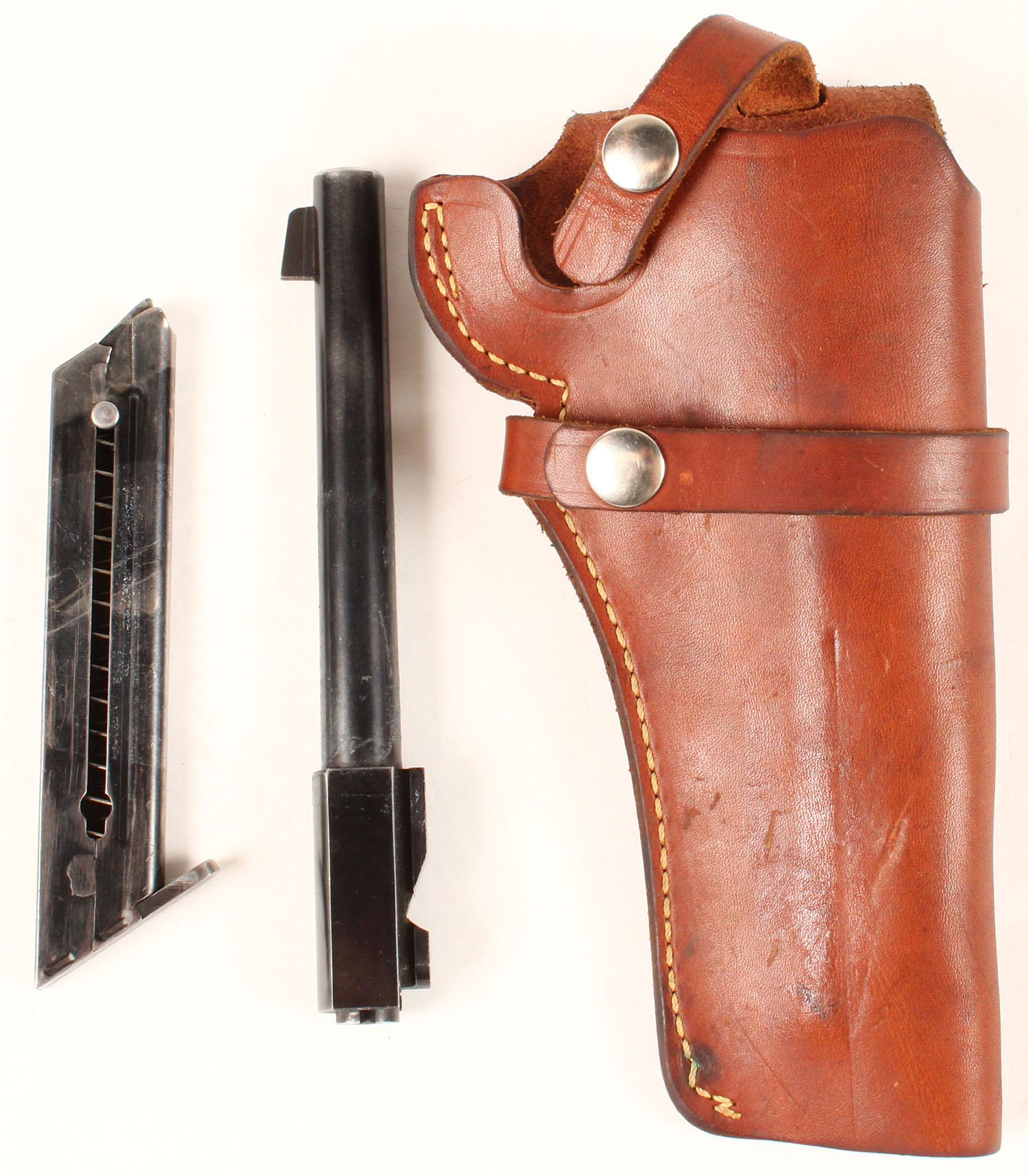 High Standard, Model ''Sport King'', CAL: 22LR, MFG: 1951, SN: 340587, Semi Auto Pistol, 4 1/2'' barrel. The HS checkered target grips are excellent, with minor dings & handling marks. The metal blue finish rates 90%, with light overall wear. Bore is excellent, with visible light wear fro honest use. The slide holds a notch rear sight & the barrel has a serrated blade front sight. Comes with a interchangeable 6 1/4'' barrel, extra mag, & a S&W leather holster. FFL or C&R Req. - Value: 250 to 450