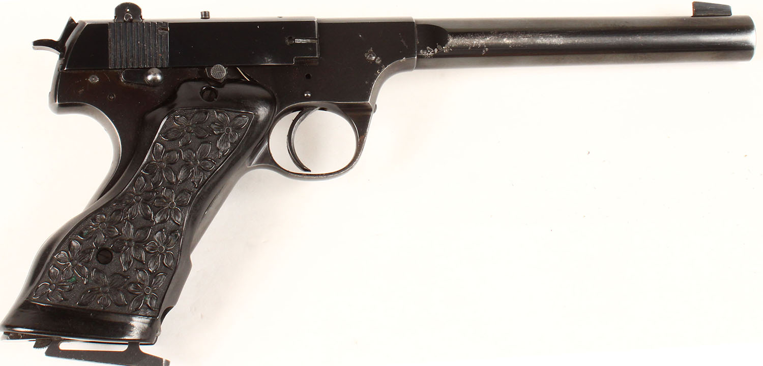 Hi-Standard, Model H-D Military, CAL: 22LR, MFG: 1947, SN: 174763, Semi Auto Pistol, 6 3/4'' barrel. The floral pattern & thumb rest plastic grips are excellent, with minor handling wear. The metal blue finish rates 95% overall, with light spotting, worn to metal grey. Bore is excellent. The slide holds an adjustable rear sight & the barrel has a serrated blade front sight. Comes with a leather holster that has ''BILLY FAYLE'' etched into it. FFL or C&R Req. - Value: 200 to 400