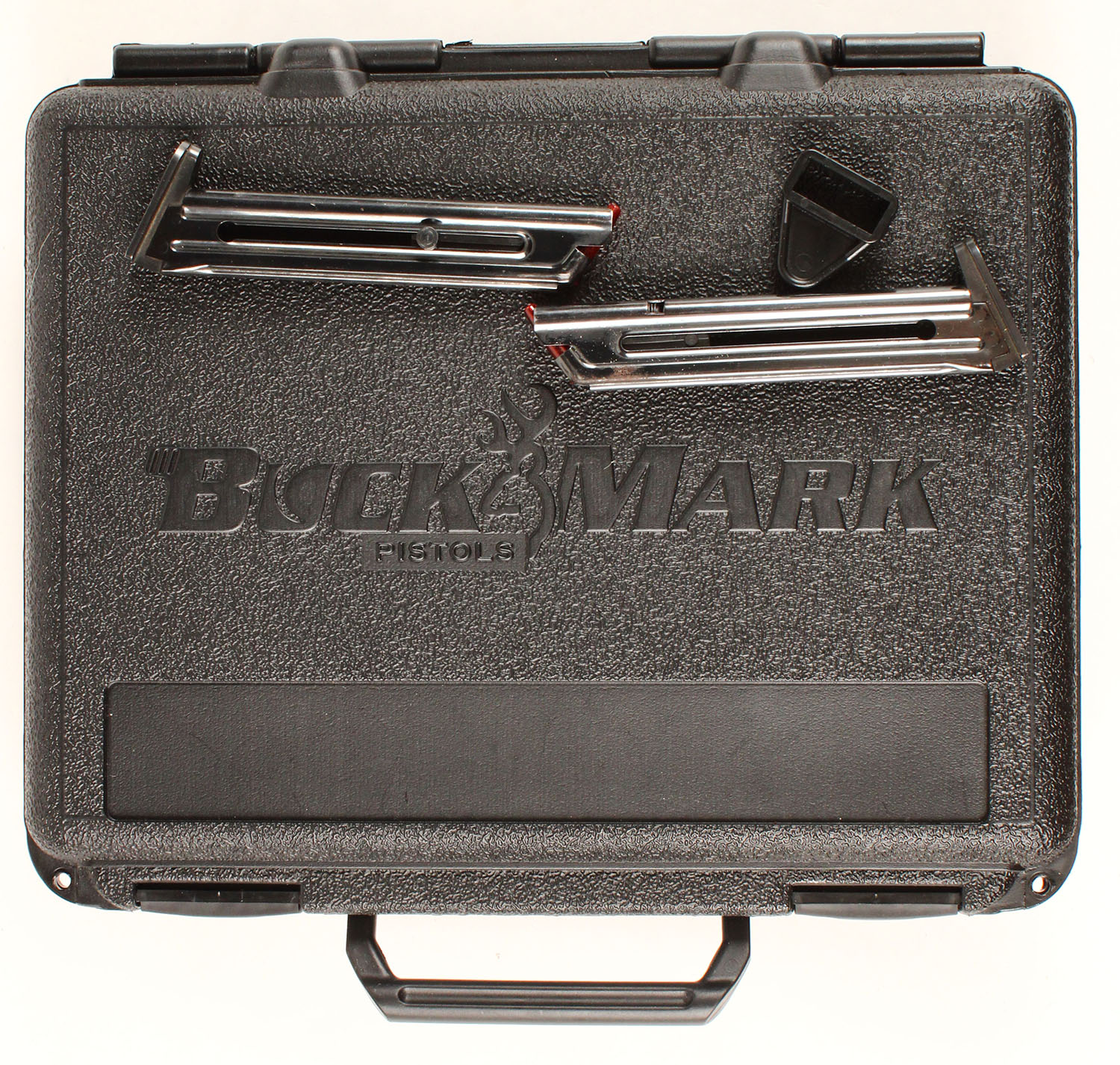 CASED, Browning, Buck Mark, CAL: 22LR, MFG: Modern, SN: 515MP16781, Semi Auto Pistol, 5 1/2'' barrel. The Browning logo checkered hard rubber grips are excellent. The matte black finish rates 99% overall. Bore is excellent. The top rib holds an adjustable rear sight & the barrel has a elevated blade front sight. Comes in original hard case, with owners manual, two extra mags, speed loader & snap caps. FFL Req. - Value: 300 to 600