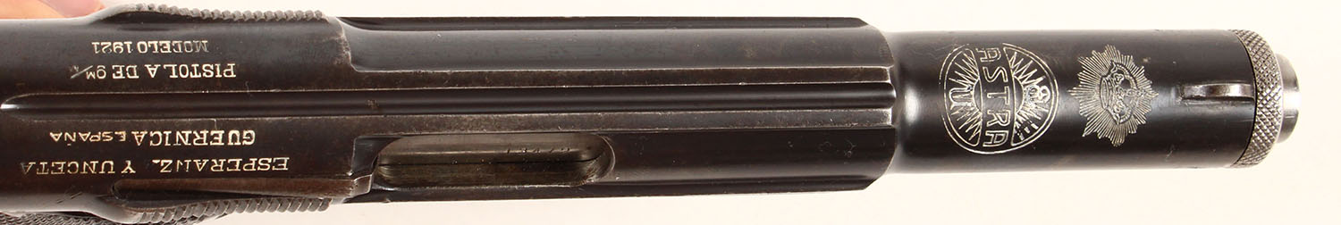 Astra, Model 1921 (400), CAL: 9mm, MFG. 1921-50, SN: 13472, Semi Auto Pistol, 6'' barrel. This pistol was the standard issue sidearm in the Spanish Army during the Spanish Civil War & also saw service in Germany during World War II. Designed to be safe to fire with a simple blowback action unaided by any breech-locking devices. The pistol also featured an internal hammer & left sided combined slide lock/safety behind the trigger guard. The Astra marked checkered plastic grips are excellent, with handling wear. The metal blue finish is a mix of original & applied blue rating 85% overall, with small areas of cleaned pitting on the left side of the pistol. Stampings are clear. Bore is very good, but consistently rough throughout. Fixed notch & blade sights. Astra stamped 8 round detachable mag. Lanyard staple. FFL or C&R Req. - Value: 200 to 400
