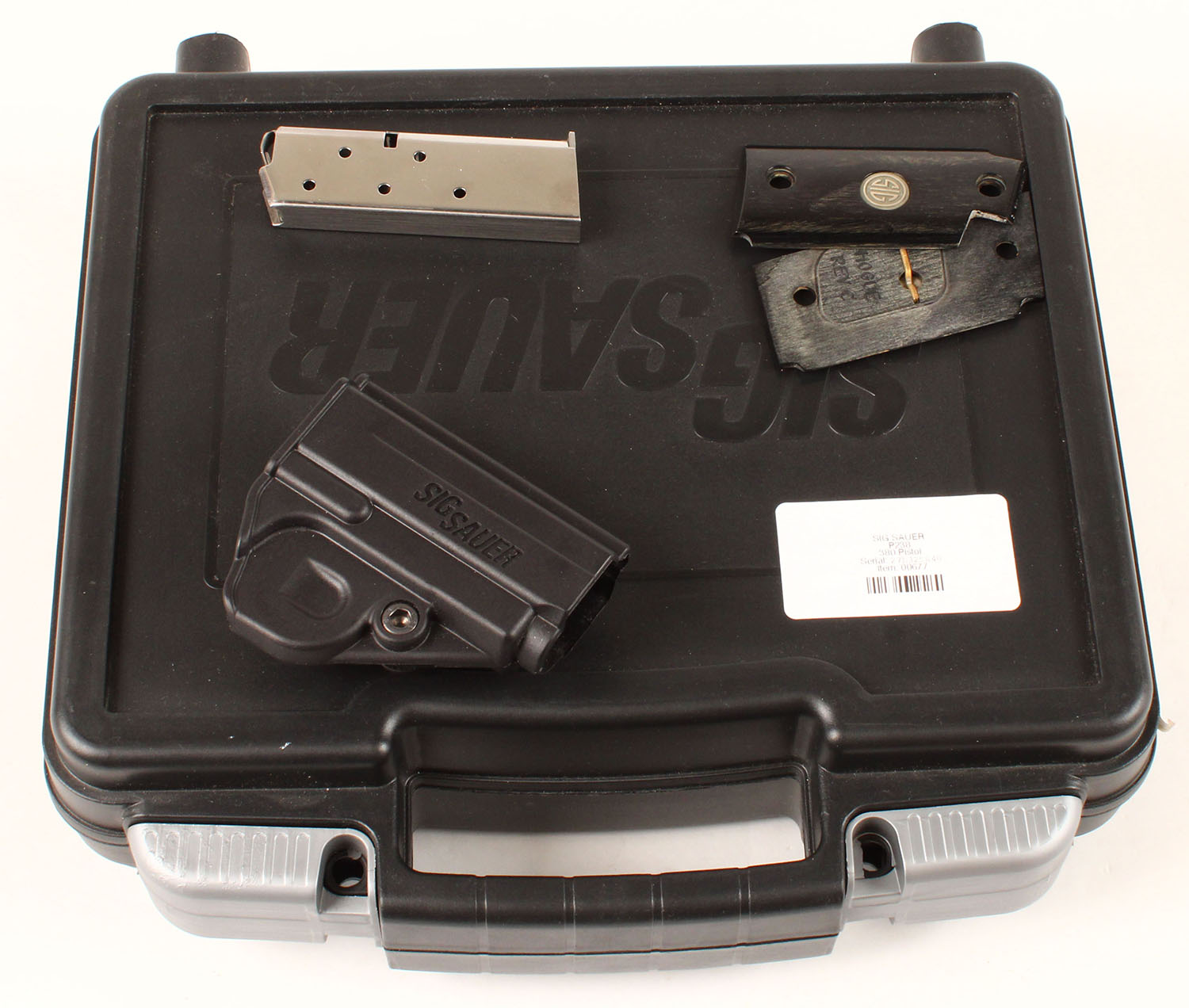 CASED, Sig Sauer, Model P238, CAL: 380 AUTO, MFG: Modern, SN: 27B325840, Semi Auto Pistol, 2 3/4'' barrel. The upgraded Hogue textured rubber grips are excellent. The stainless steel finish on the frame & slide is excellent. Bore is excellent. The slide holds a dual dot night rear sight & single night dot front sight. Comes in factory hard case, with paperwork, original grips, lock, holster & extra mag. FFL Req. - Value: 600 to 900