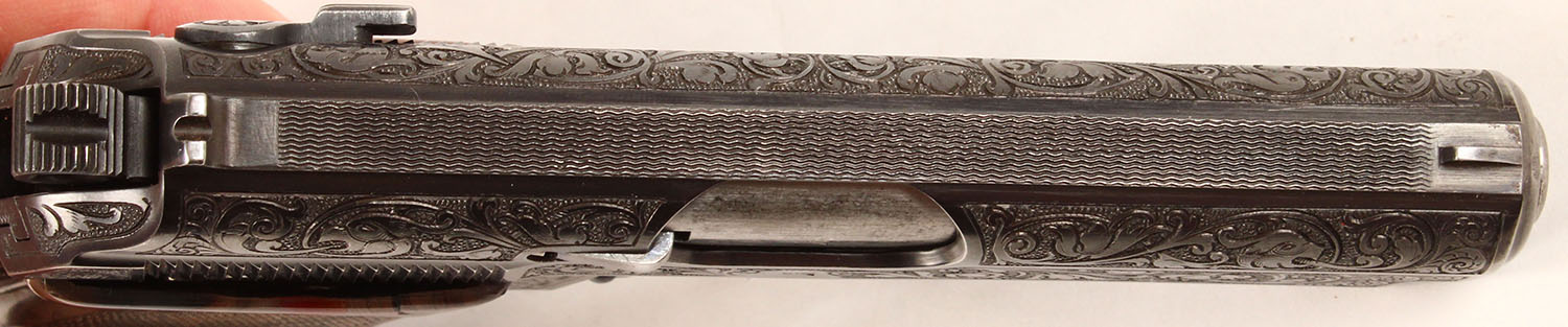 RARE CASED & ENGRAVED Walther Model PPK Presentation Pistol, CAL: .22, MFG: 1935, SN: 856183, Semi Auto Pistol, 3 1/4'' barrel. Fantastic factory engraved Pre WWII PPK. PPK stands for Polizei Pistole Kriminal. These pistols were adopted by the Luftwaffe & German Staff Officers. These are sometimes referred to as ''Presentation'' pistols as they were often presented to high level officers within the Nazi Military & other dignitaries or people of influence. This example has nearly full coverage lavish & deep floral scroll & border engraving, including on slide, frame, trigger guard, trigger, safety lever & on bottom plate of the mag. The left side of the slide is marked ''WALTHER'', ''Waffenbrik Walther, Zella-Mehlis (Thur)'', ''Walther's Patent Cal .22'', ''Mod PPK''. Right side of frame carries SN. The Walther checkered brown plastic grips are excellent, although there is a couple of tiny hairline stress cracks at the top of the backstrap & one at the bottom by the mag slot. The original metal blue finish rates 97% overall. Bore is excellent. The matted top of slide holds factory fixed sights. Come in the original factory presentation case, with second magazine, a cleaning rod & two rounds of ammunition. Case is very good to excellent. FFL or C&R Req. - Value: 7000 to 12000