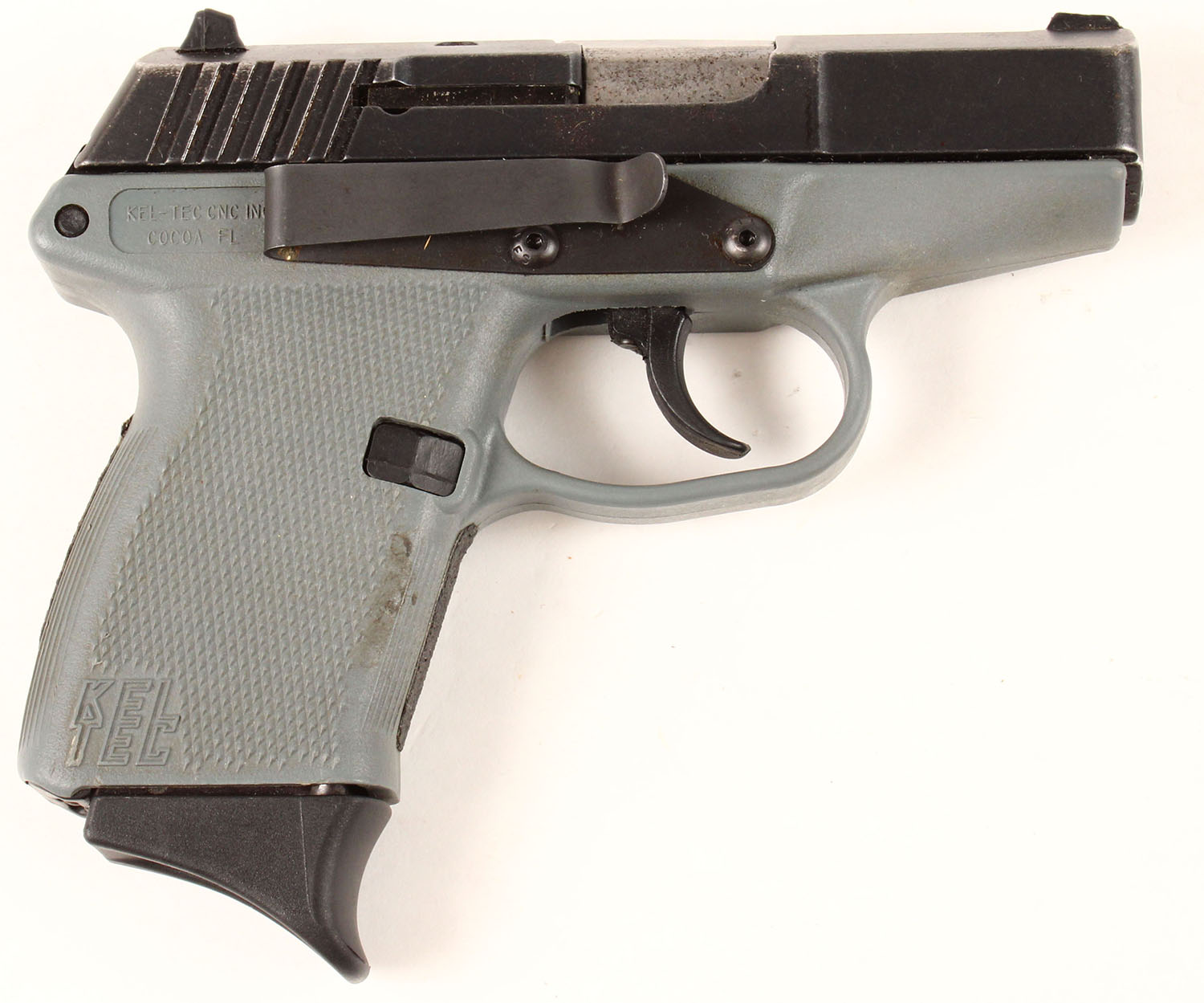 Kel-Tec, Model P-11, CAL: 9mm, MFG: Modern, SN: AA4B22, Semi Auto Pistol, 3'' barrel. The grey, Kel-Tec marked checkered polymer grip frame is very good, with handling marks, light scrapes & small areas of slight discoloration. The matte black finish on the slide rates 85% overall, with spotting, speckling & edge wear toned to metal grey. Bore is excellent. The slide holds a white two-dot rear sight & single dot front sight. The right side of the frame holds a screw-in belt clip for concealed carry. 12rd detachable mag, with grip extension. FFL Req. - Value: 150 to 250