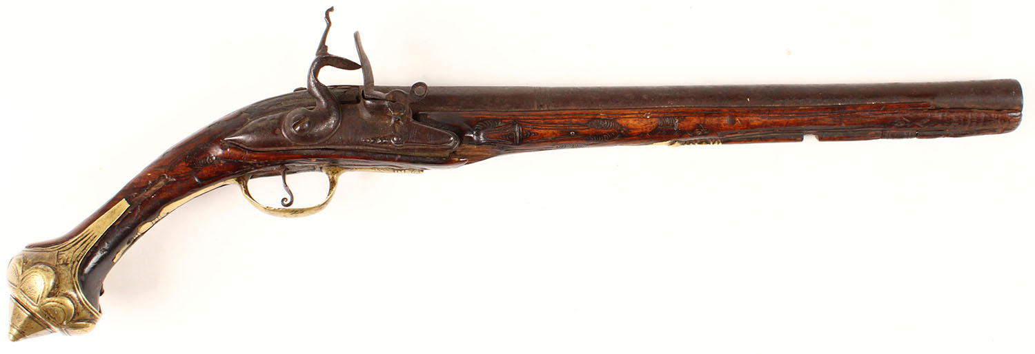 Percussion Pistol, CAL: Approx 16mm, MFG: Consignor indicates early 1700's, SN: N/A, Single Shot Black Powder Muzzleloader Pistol, 13'' barrel. The original hand carved & ornate full length stock is fair. It has a broken missing chunk from in front of trigger guard & a missing sliver from the muzzle end. Stock carries a brass buttend, brass trigger guard, brass side plate & brass front accent piece. The metal finish is a dark brown patina. Bore is good. The barrel holds no sights. Hammer & trigger do function, but with weak spring from due to stock break. Black Powder, Antique, No FFL Req. - Value: 100 to 350