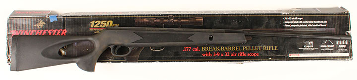 Winchester, Model 1250SS, Caliber 177 Pellet, Single Break barrel pellet rifle, 18'' rifled steel barrel, composite stock with comfortable thumbhole grip & 3x9x32 scope, original box with paperwork. Grade: Excellent ++ - Value: 50 to 150