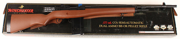 Winchester, Model M14, Caliber 177 Pellet, CO2 Semi-Auto Dual ammo BB or Pellet rifle, 24'' rifled steel barrel, composite stock, original box with paperwork. Grade: Excellent ++ - Value: 40 to 120