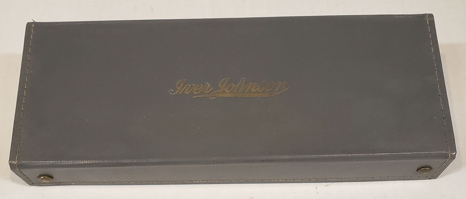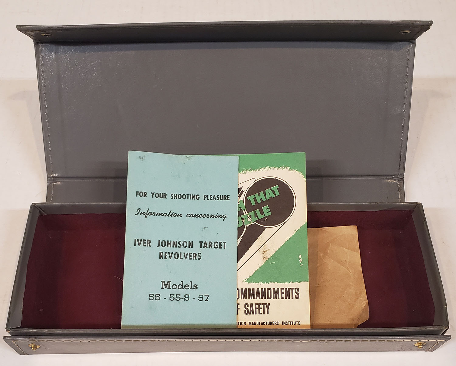 BOX ONLY: Iver Johnson Original factory N.O.S. revolver snap close box. Gray exterior, burgundy interior. Came from the remaining inventory when factory closed. For Target Revolver Models 55- 55 S- 57, with the original blue brochure for these models, safty pamphlet & brown tissue. Condition is excellent. - Value: 20 to 100