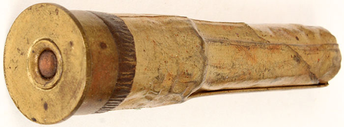 N/H 476 India Police OAL. 2 3/4'' coiled case battery cup, oval copper primer, crimped mouth over tan wad. Grade: Excellent - Value: 10 to 30