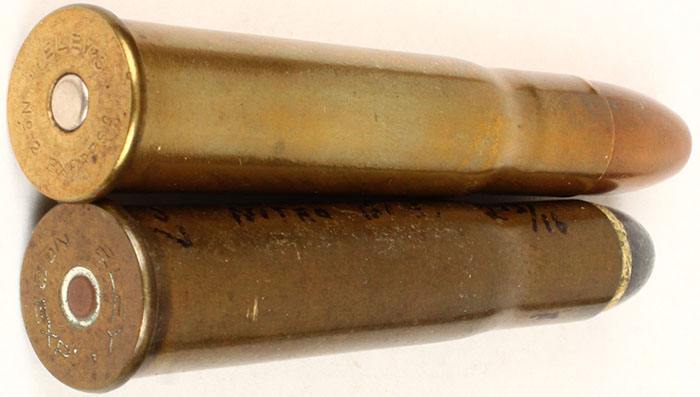 Lot of 2-- 577-500 #2 Express, (1) HS=''ELEY No2 EXP'', lead flatnose paper patch hollow point. (1) HS=''ELEY'S No 2 EXPRESS'', cj rn fmj (nitro for black). Grade: Excellent - Value: 10 to 50