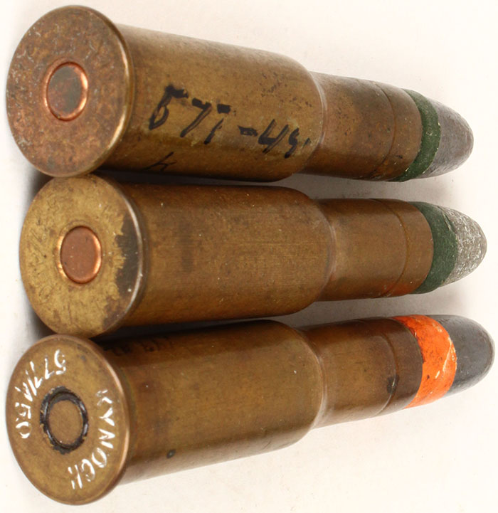 Lot of 3, 577-450 Martini Henry. HS=''KYNOCH 577/450'', All Commercial Loadings: 1 is a rn lead w/ orange paper patch (cordite rifle) & 2 have a green paper patch over a rn lead bullet (cordite carbine). Grade: Excellent - Value: 20 to 50