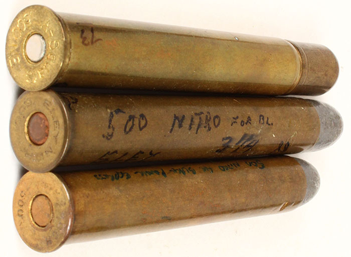 Lot of 3. 500 Caliber. (1) 500 x 3''--HS ''KYNOCH 500'', rn lead w/ copper tube. (1)-- 500 x 3/25''--HS ''ELEY NITRO 500'', rn lead w/ copper tube. (1) 500 x3''--HS ''A Square 500 NE'', rn monolith solid. Grade: Excellent - Value: 20 to 60