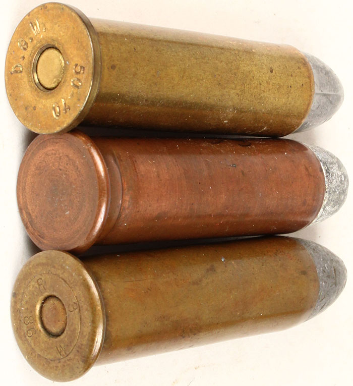 Lot of 3, 50-70 Govt. (1) HS:''R 3 W 86'', Winchester contract, Lead. (1) Benet primed copper case, lead. (1) HS:''DGW 50-70'', Dixie Gun Works. Lead. Grade: Excellent - Value: 20 to 70
