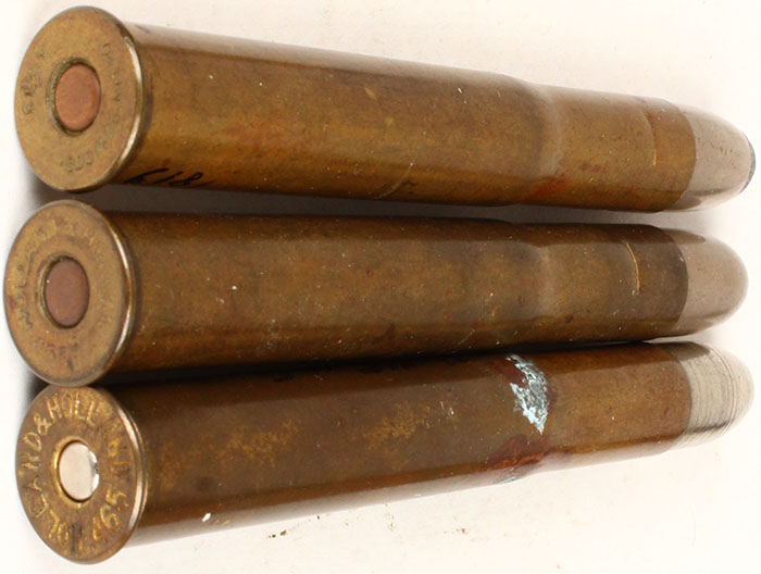 Lot of 3. 500/465 Nitro Express. (1) HS:''ELEY 500/465 NITRO'', RN CN SP. (1) HS:''HOLLAND & HOLLAND .465E'', RN CN FMJ. (1) HS:''HOLLAND & HOLLAND 465'', RN CNCS FMJ. Grade: Very Good ++ - Value: 2 to 100