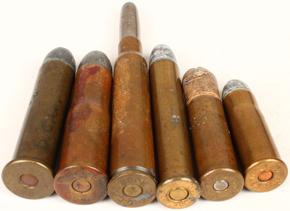 Lot of 6. All by Dominion Cartridge Co. & so headstamped. One each: 38-40 WCF, 44-40 WCF (with paper covered shot load), 45-75 WCF, 45-60, 38-55, 280 Ross. Grade: Very Good + - Value: 40 to 70